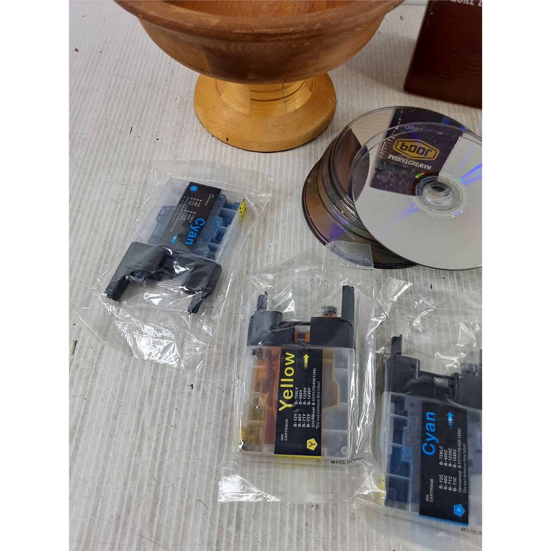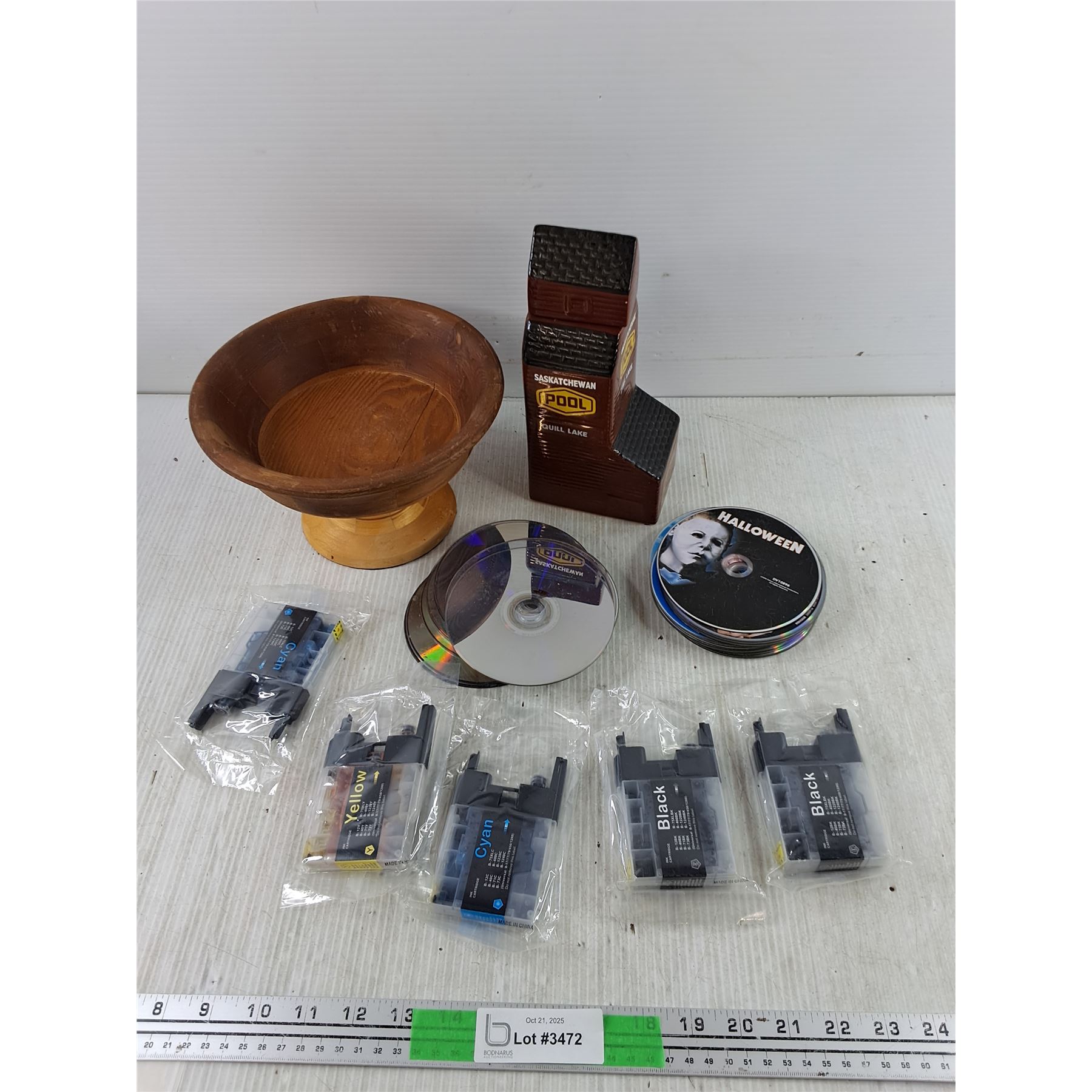 Footed Wooden Bowl, Ink Cartridges, Various CDs, Saskatchewan Pool Bottle