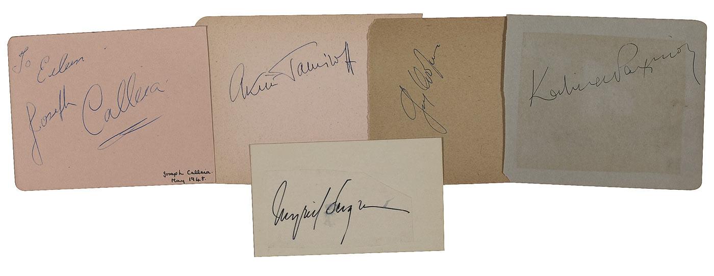Five ink signatures on individual album pages and one slip. Signers are: Gary Cooper, Ingrid Bergman, Akim Tamiroff, Katina Paxinou, and Joseph Calleia (ins). In overall very good to fine condition, with a block of even toning over Paxinou’s name and a small water stain over the first letter of Bergman’s last name.