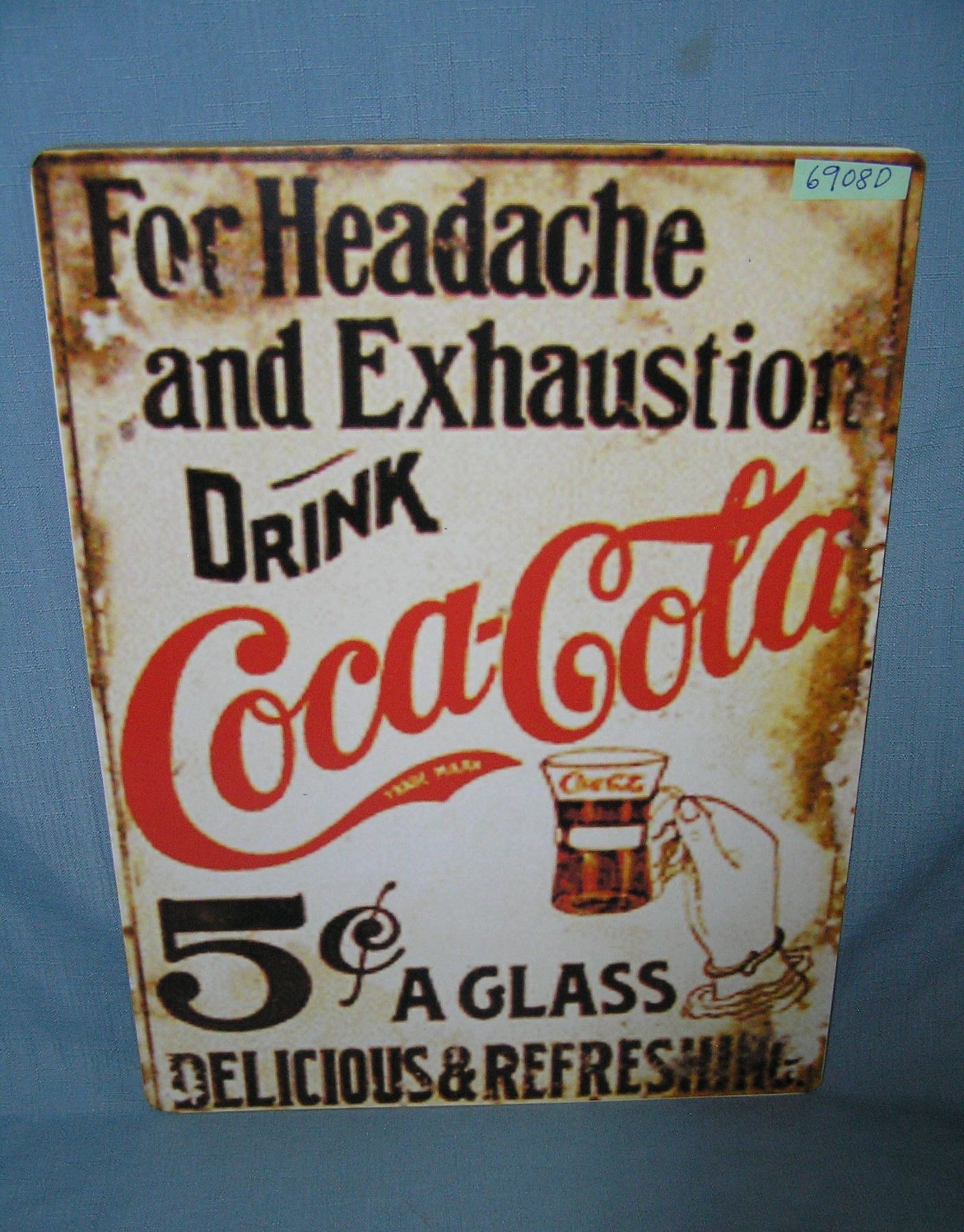 For headache and exhaustion drink Coca Cola retro style advertising sign printed on PVC hardboard these signs are auctioned for their decorative and display purposes 12 inches by 16 inches est. value $40.00-$50.00