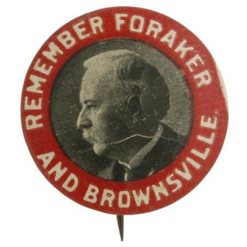 <B>Foraker and Brownsville: A Rare Early Cause Pin</B></I> picturing the Senator himself, Joseph Benson Foraker of Ohio. Often considered an adversary of Teddy Roosevelt, Foraker immeshed himself into the "Brownsville Affray", a civil rights issue surrounding the dishonorable discharge of 187 Black soldiers from Fort Brown in Brownsville, Tx. by President Roosevelt. significantly cracked but still intact, this rare 1 1/4" button is certainly one of the earliest pertaining to the Civil Rights cause.<BR><BR><b>Shipping:</b> Miscellaneous Collectibles, Smal (<a target="_blank" href="http://www.heritageauctions.com/common/shipping.php">view shipping information</a>)