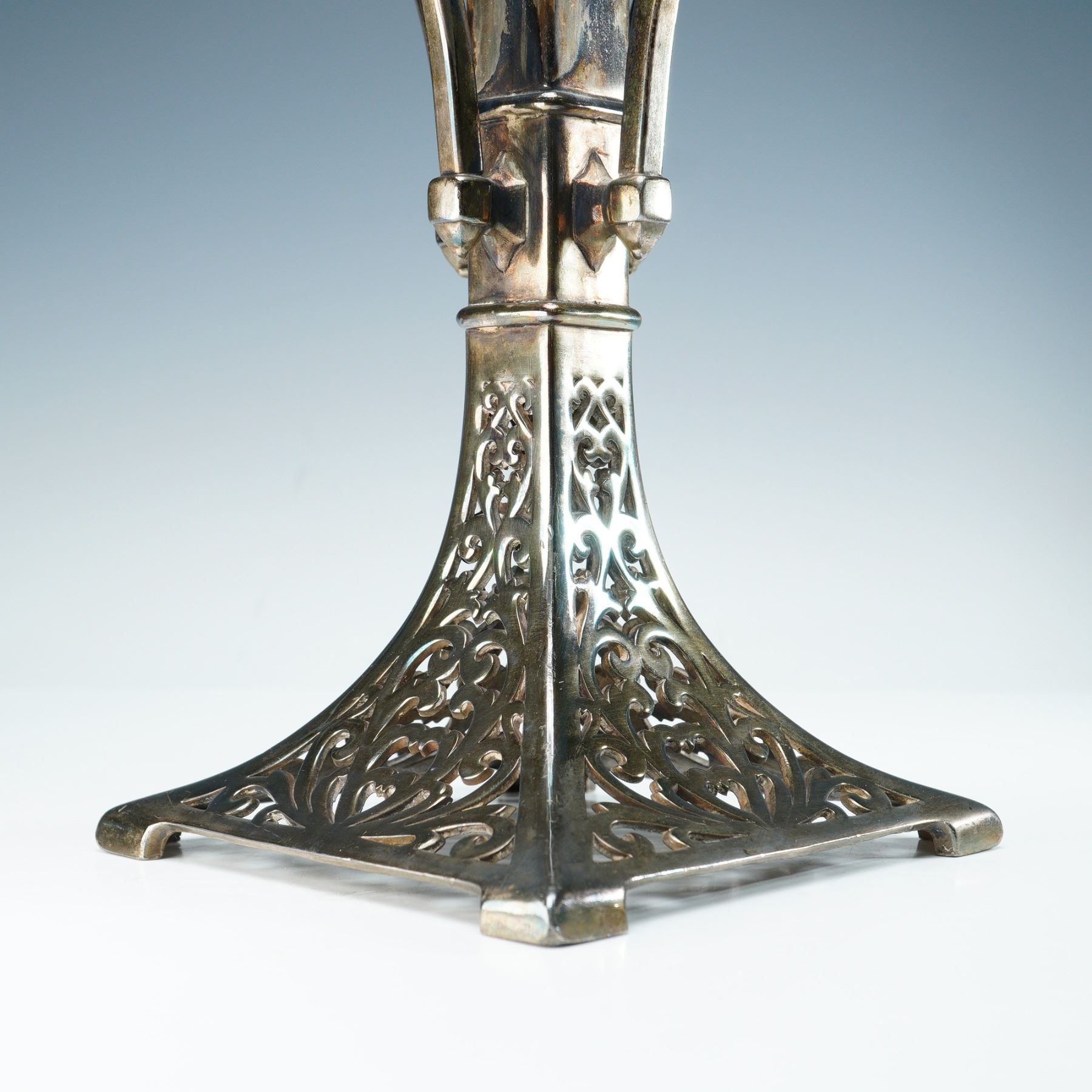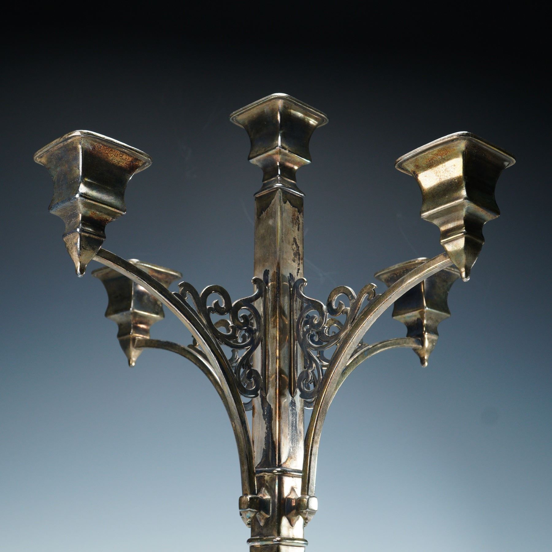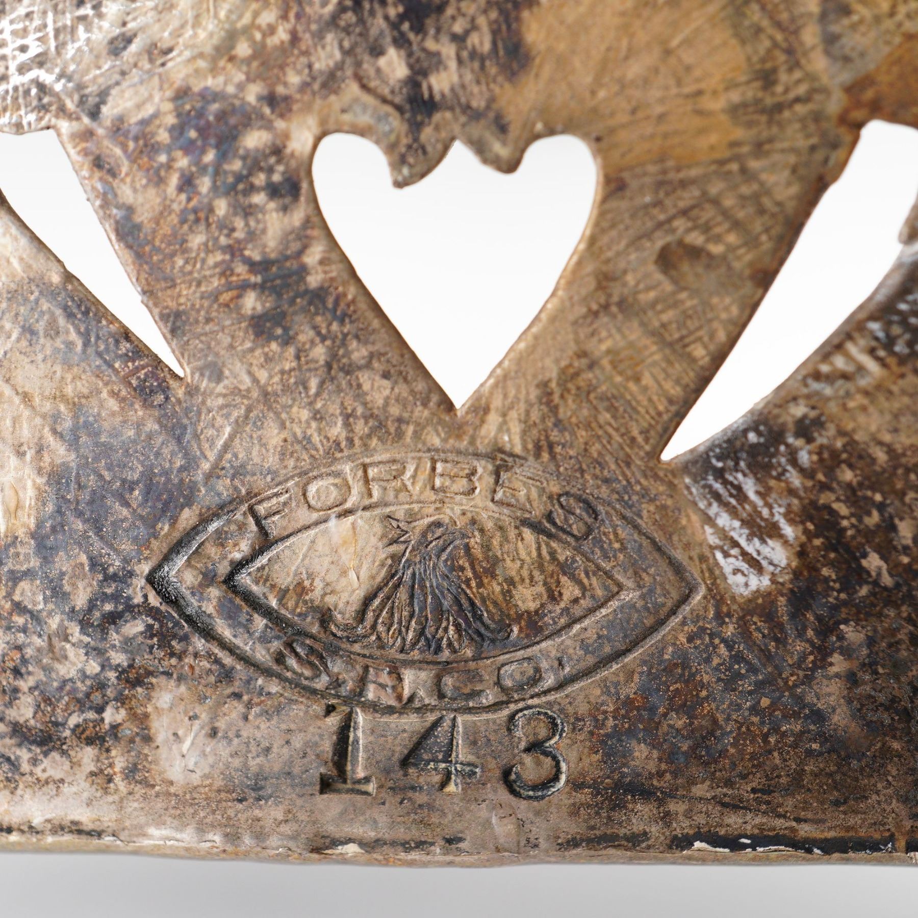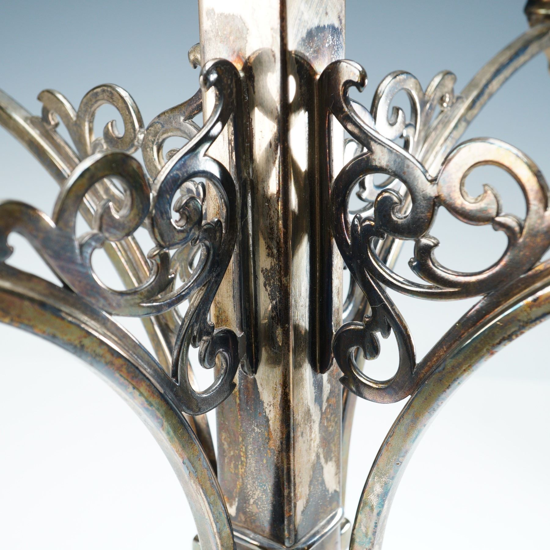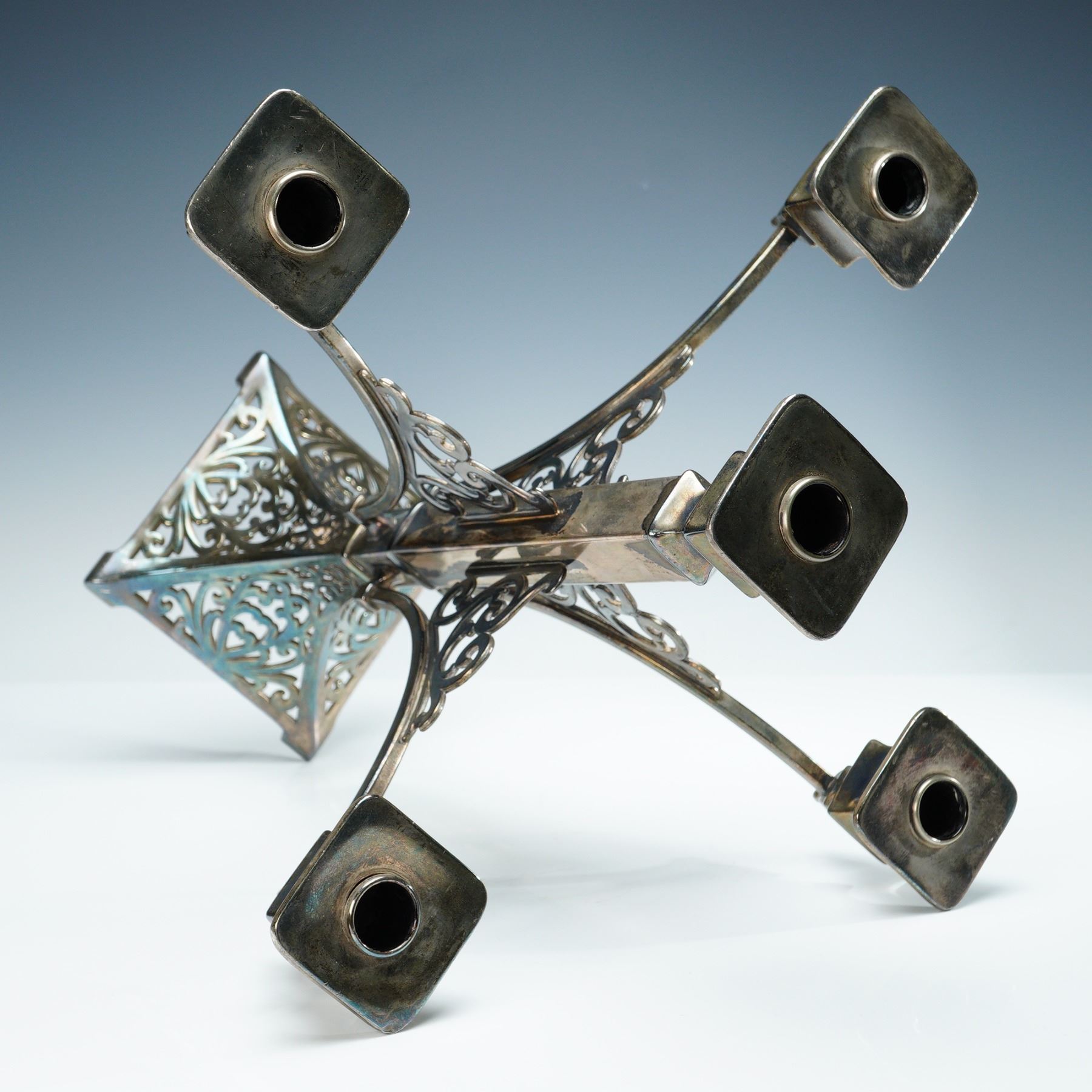 Impressive silverplated five-socket candelabra by Forbes Silver Co., featuring an elaborate openwork base with scrolling foliate motifs and graceful upward-curving arms supporting squared candle sockets. The design reflects early 20th century craftsmanship with subtle Art Nouveau influences, combining decorative flourish and structural symmetry. Underside bears the impressed Forbes Silver Co. hallmark. The piece retains a warm antique patina and displays beautifully as a centerpiece or mantle accent.