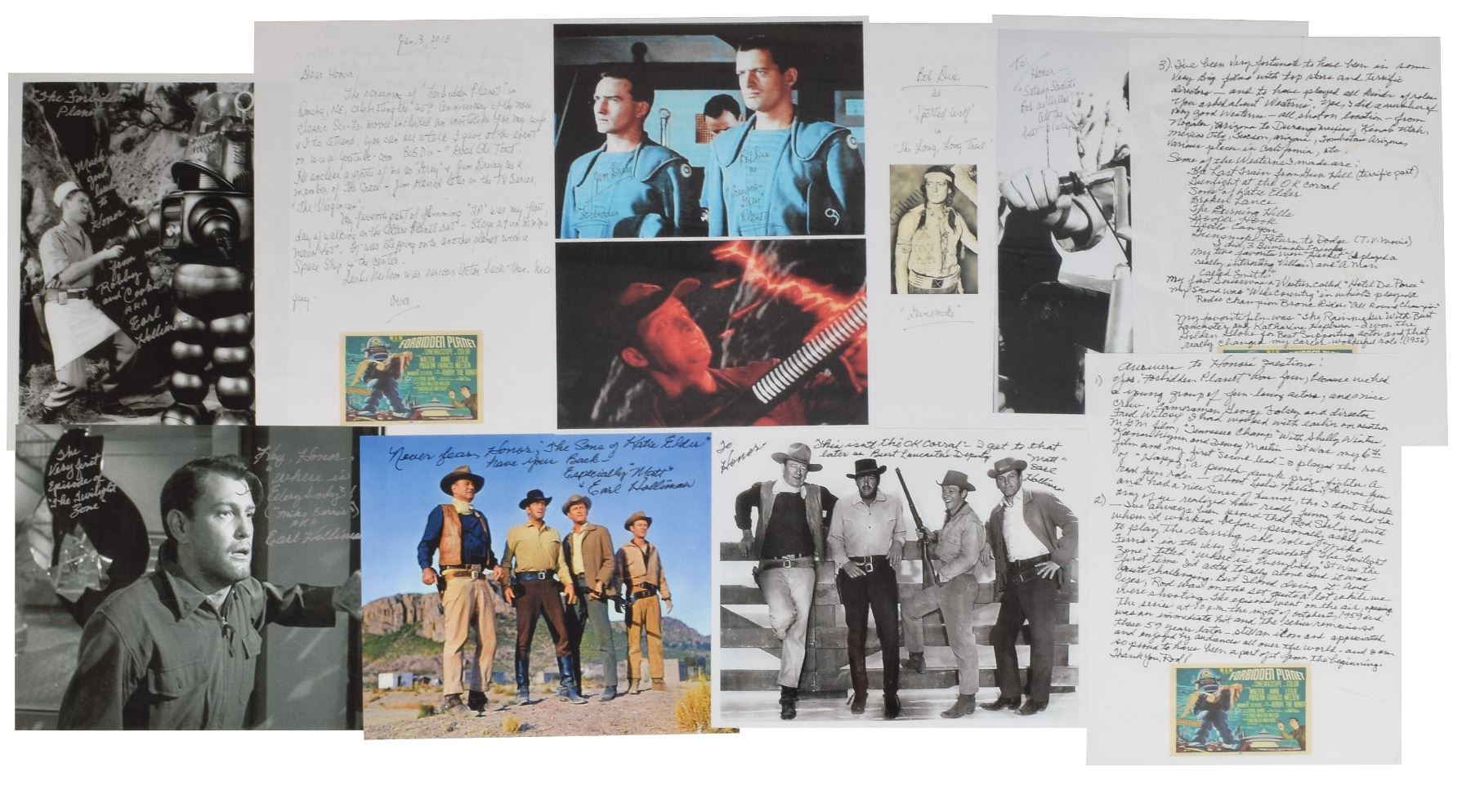Appealing collection of nine items signed by either Earl Holliman or Bob Dix, actors from the classic 1956 science fiction film Forbidden Planet, including: an ALS signed “Bob Dix,” one page both sides, 8.5 x 11, January 3, 2018, in part: “My favorite part of filming ‘FP’ was my first day of walking on the Altaire Planet set—Stage 27 on MGM’s main lot. It was stepping on to another planet with a Space Ship in the center”; an unsigned handwritten letter from Holliman, two pages, 8.5 x 11, in part: “’Forbidden Planet’ was fun because we had a young group of fun-loving actors; and a nice crew. Cameraman George Folsey and director Fred Wilcox I had worked with earlier on another MGM film ‘Tennessee Champ’…I’ve always been proud that Rod Serling, with whom I’d worked before, personally asked me to play the starring role of ‘Mike Ferris’ in the very first episode of ‘The Twilight Zone.’” Also included are three 8.5 x 11 printed sheets featuring images of Dix’s roles in Forbidden Planet, Gunsmoke, and Satan’s Sadists, with Dix signing each in black ballpoint; and four glossy photos, 8 x 10 and 10 x 8, depicting Holliman’s roles in Forbidden Planet, The Twilight Zone, and The Sons of Katie Elder, with Holliman signing and inscribing each in silver ink. In overall fine to very fine condition.