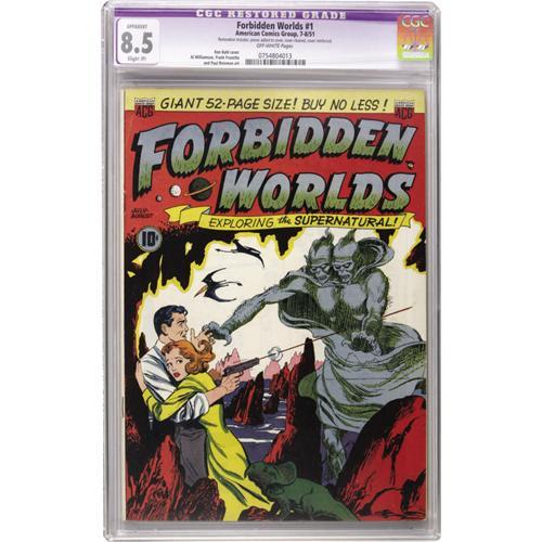 <B>Forbidden Worlds #1 (ACG, 1951) CGC Apparent VF+ 8.5 Slight (P) Off-white pages.</B></I> Al WIlliamson and Frank Frazetta art. Ken Bald cover. CGC notes, "Restoration includes: pieces added to cover, cover cleaned, cover reinforced." Overstreet 2006 GD 2.0 value = $156; VG 4.0 value = $312; FN 6.0 value = $468; VF 8.0 value = $975; VF/NM 9.0 value = $1,538.<BR><BR><b>Shipping:</b> Slabbed Comic (<a target="_blank" href="http://www.heritageauctions.com/common/shipping.php">view shipping information</a>)