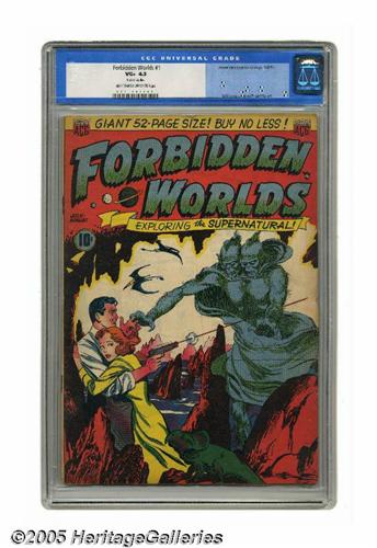 <B>Forbidden Worlds #1 (ACG, 1951) CGC VG+ 4.5 Light tan to off-white pages.</B></I> Al Williamson and Frank Frazetta art. CGC notes, "rusted staples." Overstreet 2005 VG 4.0 value = $308. CGC census 3/05: 3 in 4.5, 14 higher.