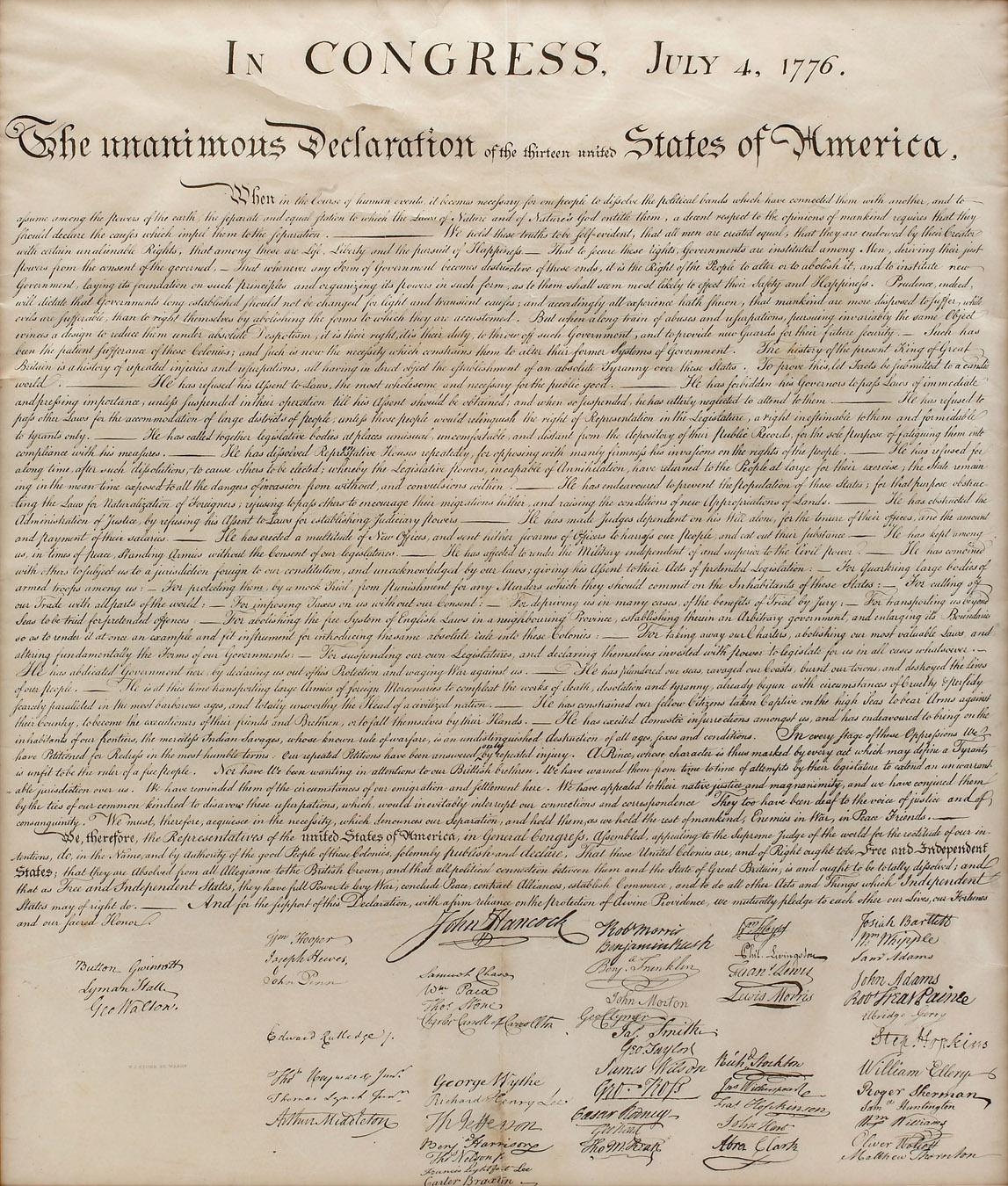 1843 Force Declaration of Independence from the original copper plate by William Stone. Measures approximately 25.5'' x 29'' on rice paper. This offering represents an opportunity to obtain one of the earliest copies of the Declaration of Independence. In 1823, Congress authorized the production of facsimile copies of the Declaration of Independence for two reasons: the original was deteriorating rapidly and many of the aging original Signers sought copies. John Quincy Adams, then Secretary of State, oversaw the project and commissioned noted engraver William J. Stone to reproduce the document. Stone used a new Wet-Ink transfer process to create a copper plate from which facsimile copies were made. By wetting the original document, some of the original ink was transferred to the copperplate, which was then used for printing. Stone printed 201 copies on vellum, keeping one copy for himself (now residing in the Smithsonian) and distributing other copies to Thomas Jefferson, President James Monroe, members of Congress, surviving original Signers, various colleges and universities, and others. Of the original 201 copies, only 31 examples are currently known to exist, 19 of which are permanently housed in museums. The remaining dozen vellum examples are rarely offered for sale and today typically bring $200,000 or so. In 1843, Peter Force used the original Stone copperplate to print additional copies of the Declaration of Independence on rice paper for inclusion in Volume I of his multi-volume book, ''American Archives.'' Congress authorized up to 1,500 copies of the book to be printed, and while the actual number of copies printed is unknown, it's generally estimated at 500. It is believed that fewer than half of the rice paper copies still exist (of which this is an example) in varying states of preservation. The Stone and Force copies represent an irony: certainly, they allowed additional people and institutions to obtain an identical facsimile of this most beloved of all historic American documents, but Stone's Wet-Ink transfer process contributed to the deterioration of the original signed copy of the Declaration. The parchment did not respond well to water, with the unfortunate result being that the original Declaration of Independence, on display in our nation's capitol, is in a rather sad state of preservation. This Declaration has been folded for its original purpose of inclusion in Force's book and is in overall near fine condition with only slight chipping. A visually stunning example of one of America's most beloved documents.