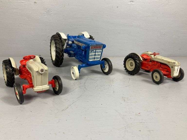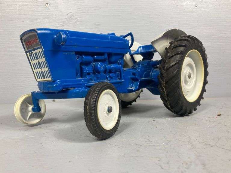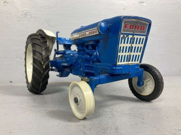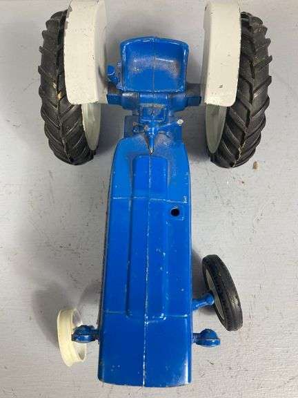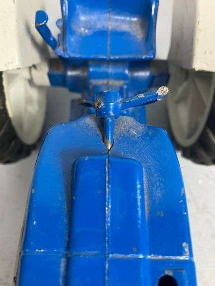 Blue tractor has missing and damaged parts.