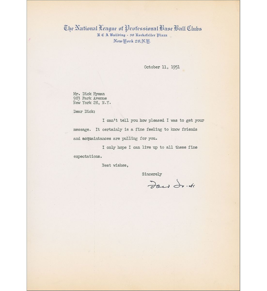 TLS, one page, 8 x 11, National League letterhead, October 11, 1951. Letter to Dick Hyman. In part: “It certainly is a fine feeling to know friends and acquaintances are pulling for you. I only hope to live up to all these fine expectations.” In fine condition, with intersecting folds, one vertical fold passing through a single letter of the signature, and light toning to the borders. At the time of writing, Frick had just been appointed as commissioner.