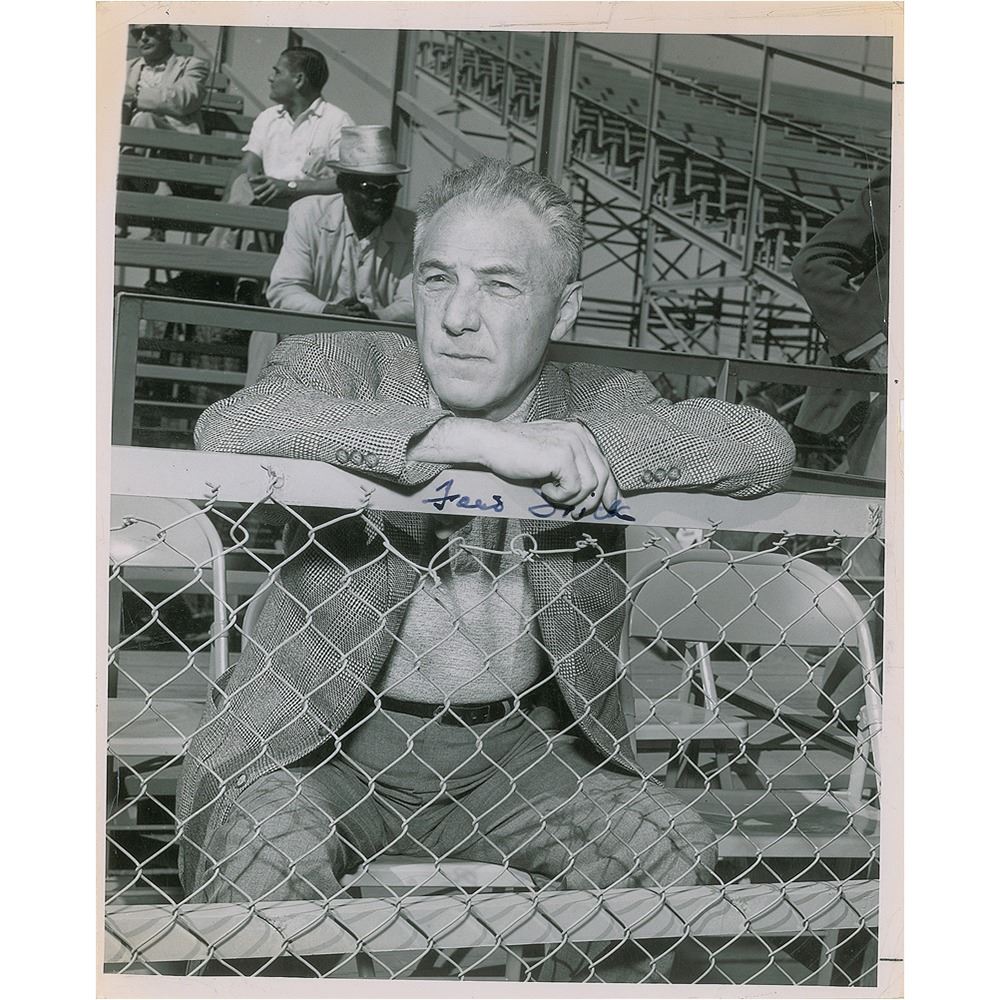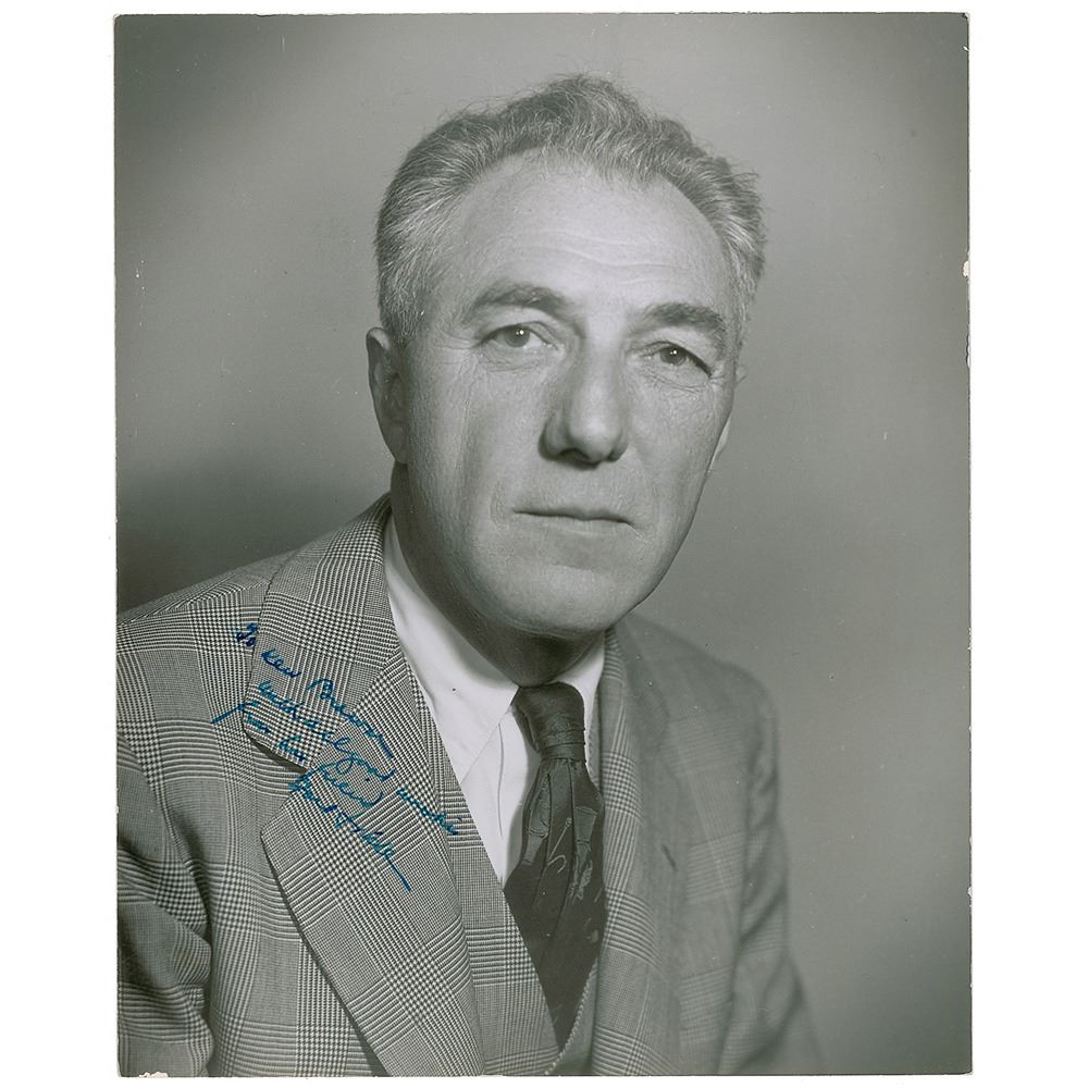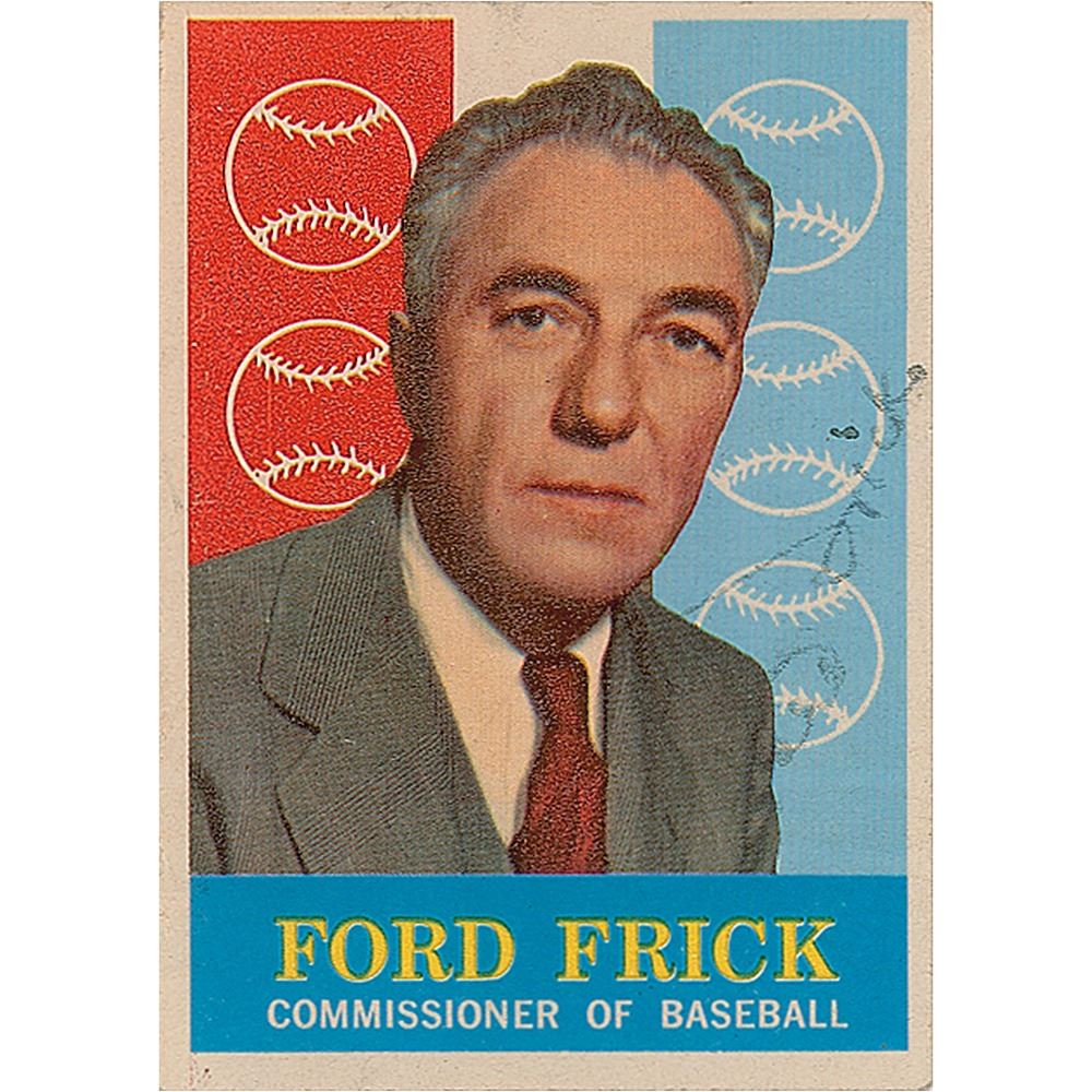 Group of three items signed by Major League Baseball Commissioner Ford Frick, including: a vintage matte-finish 8 x 10 portrait by Shelburne Studios, signed and inscribed in fountain pen, "To Ken Browne, with all good wishes, from his friend Ford Frick"; a vintage glossy 8 x 10 photo of Frick seated at a ballpark, signed in fountain pen, "Ford Frick"; and a 1959 Topps #1 baseball card, indistinctly signed in ink by Frick. In overall very good to fine condition, with moderate to heavy overall creasing and surface impressions to the uninscribed photo, and the signature on the baseball card very light but legible.