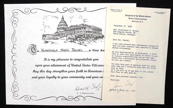 Ford, Gerald R (1913-2006) 38th President of the United States (1774-1977). He became President on August 9, 1974 when Richard Nixon resigned. He served in the U.S. House of Representatives from 1949 to 1973, when he was appointed Vice President upon the resignation of Spiro Agnew. Typed letter signed ("Jerry Ford") as congressman, 1 page, 8 x 5¼", September 17, 1956. Congratulating Mrs. Wlastimila M. Techel of Grand Rapids upon becoming a citizen. Fine. With a photocopy of Mrs. Techel's certificate of citizenship.