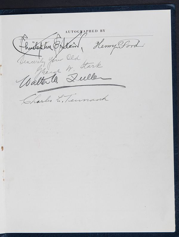 Ford, Henry. Bold signature on back inside cover of program for a Detroit civic event honoring Judge Christopher Stein, an old friend of Ford's. Several other attendees also signed. With archive of the event and tattered newspaper page of photos from the event.