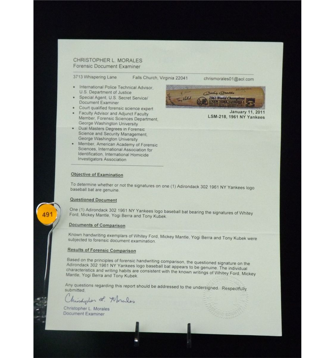 Ford, Mantle, Berra and Kubek Autographed Baseball Bat. Adirondack 302 with 1961 NY Yankees Logo Signed by: Whitey Ford, Mickey Mantle, Yogi Berra and Tony Kubek. Appraised or estimated retail value $15,000. COA by Christopher Morales. All Sales Final. Please see terms and conditions of auction.