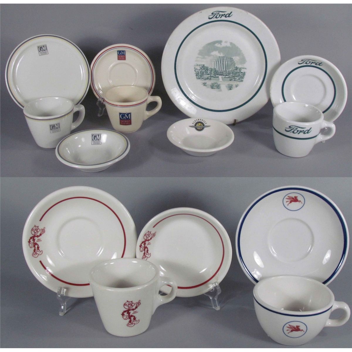Ford Motor, GM Detroit Reddy Killowatt and Mobiloil Dinnerware. 14 pieces total. No chips or cracks. Large Ford plate measures 9 inch diameter.