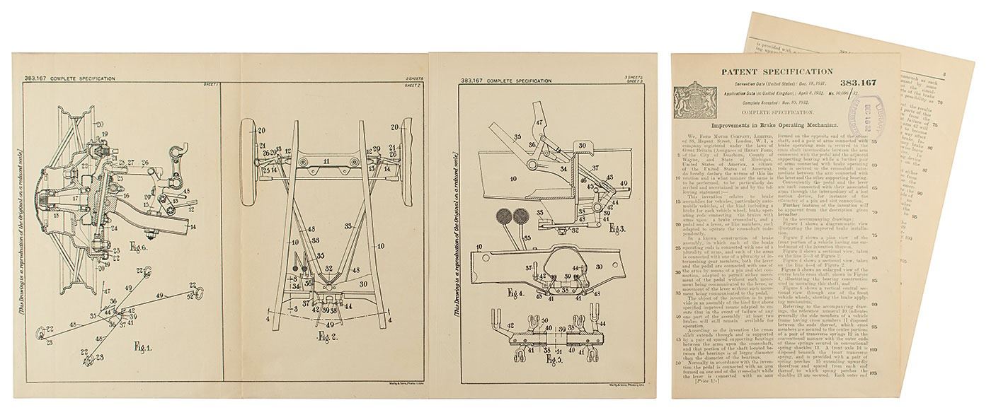 Original patent lithographs for the Ford Motor Company's improvements in a vehicle's brake operating mechanism, two pages, 12.5 x 10.25 (linen-backed) and 6.75 x 10.25 (not linen-backed), November 11, 1932. The diagrams feature multiple views of the improved brake mechanism design. The top borders read: "383,167 Complete Specification." The lower borders feature the printed text: "Malby & Sons, Photo-Litho." The left borders read: "This Drawing is a reproduction of the Original on a reduced scale." Includes the printed British "Patent Specification" document, two pages both sides, which describes the invention as "an improved means adapted to ensure that in the event of failure of any one part of the assembly at least two brakes will still remain available for operation." The specification sheet bears a "U.S. Patent Office Library" ink stamp on the first page. In fine condition.