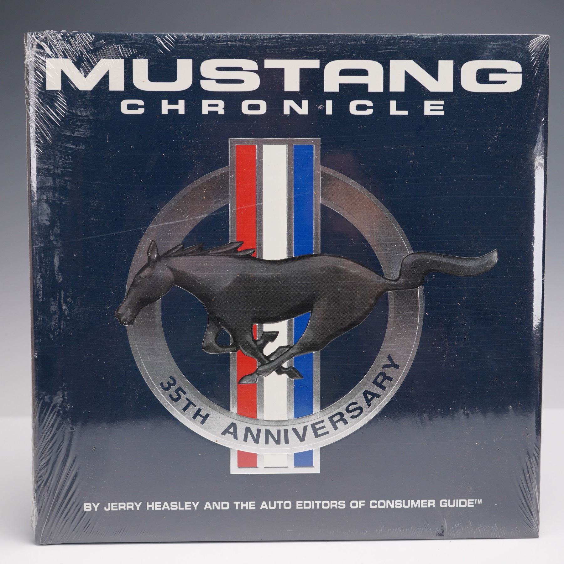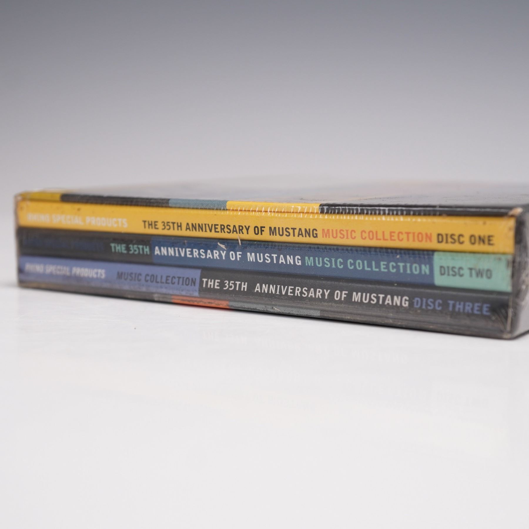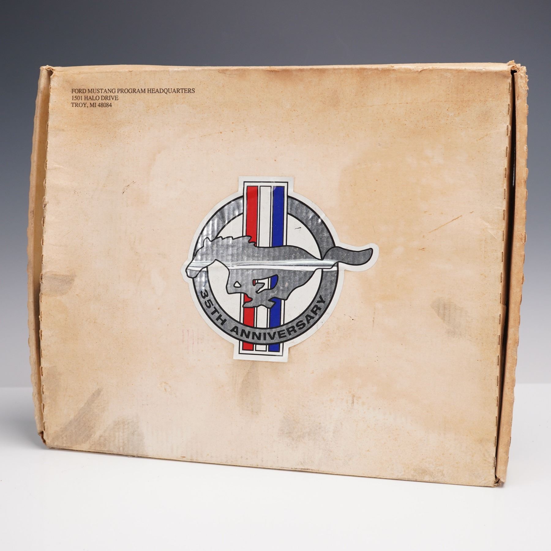 Ford Mustang 35th Anniversary Collector's Box Set. A commemorative box set produced by Ford Motor Company for the 35th anniversary of the Mustang. The set includes the shrink-wrapped hardcover book Mustang Chronicle by Jerry Heasley and the editors of Consumer Guide, a sealed three-disc music collection titled Reborn to Run, a 35th anniversary Mustang keychain, and a matching logo sticker. All items are housed in the original factory-labeled shipping box from Ford Mustang Program Headquarters in Troy, Michigan. A nostalgic tribute to one of America's most iconic muscle cars.