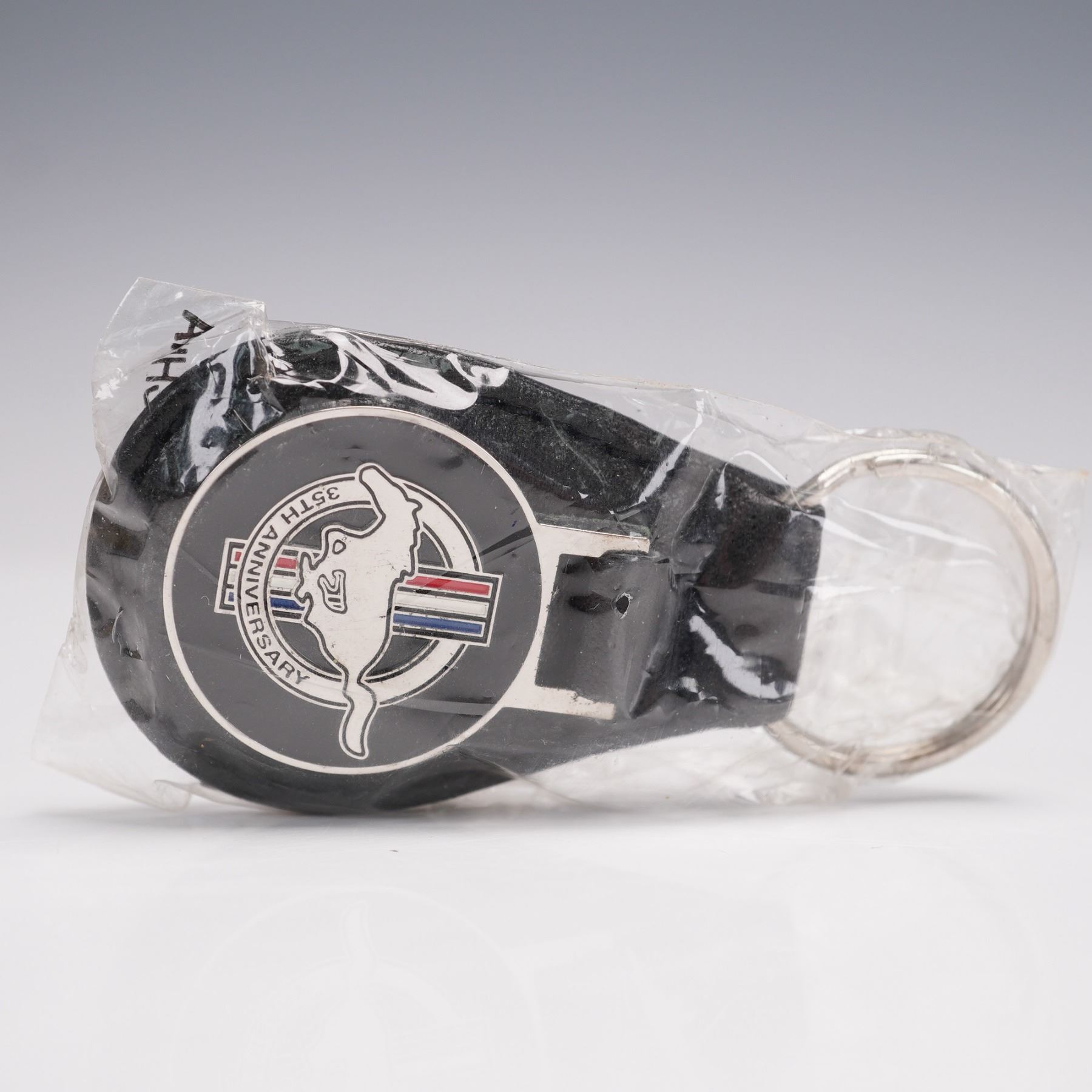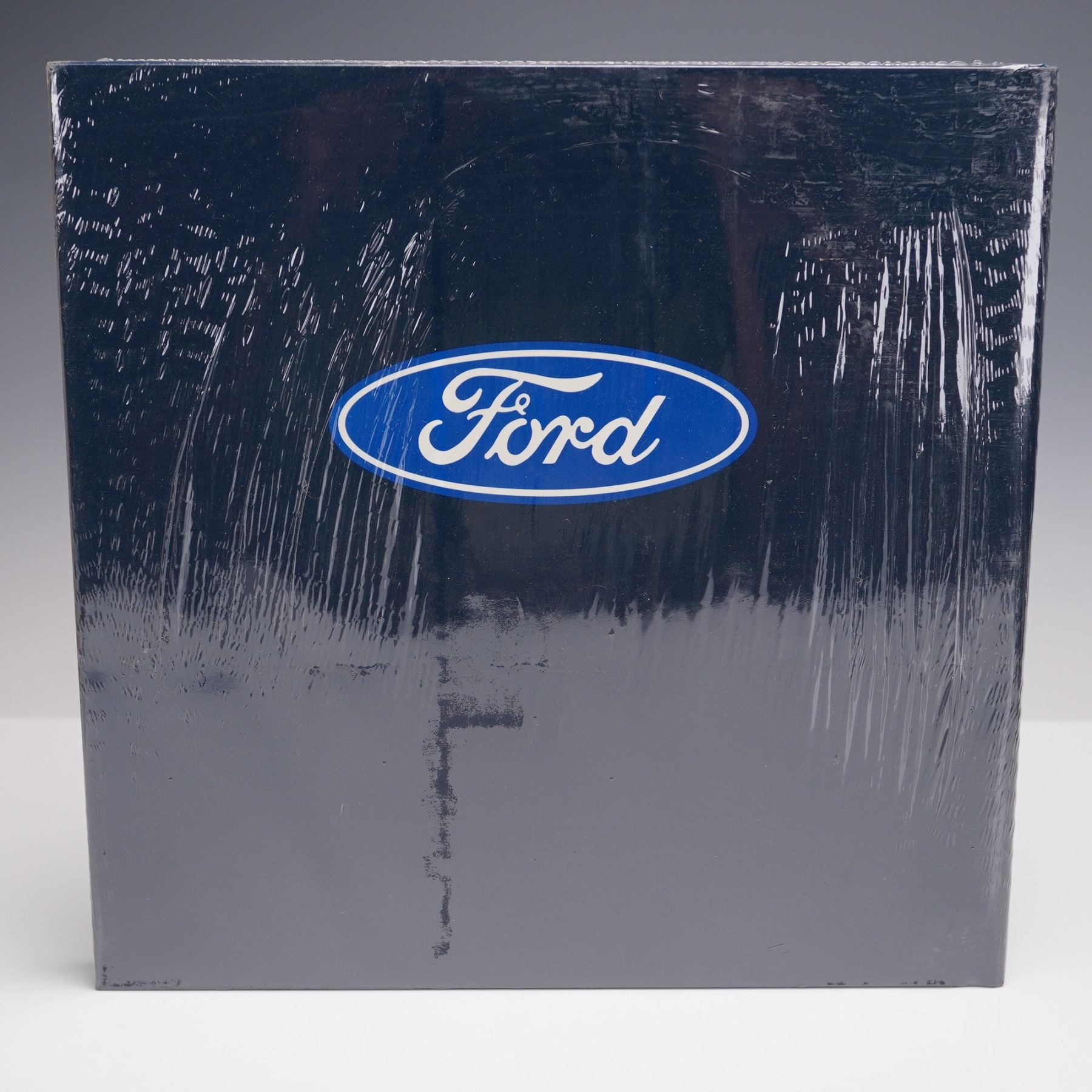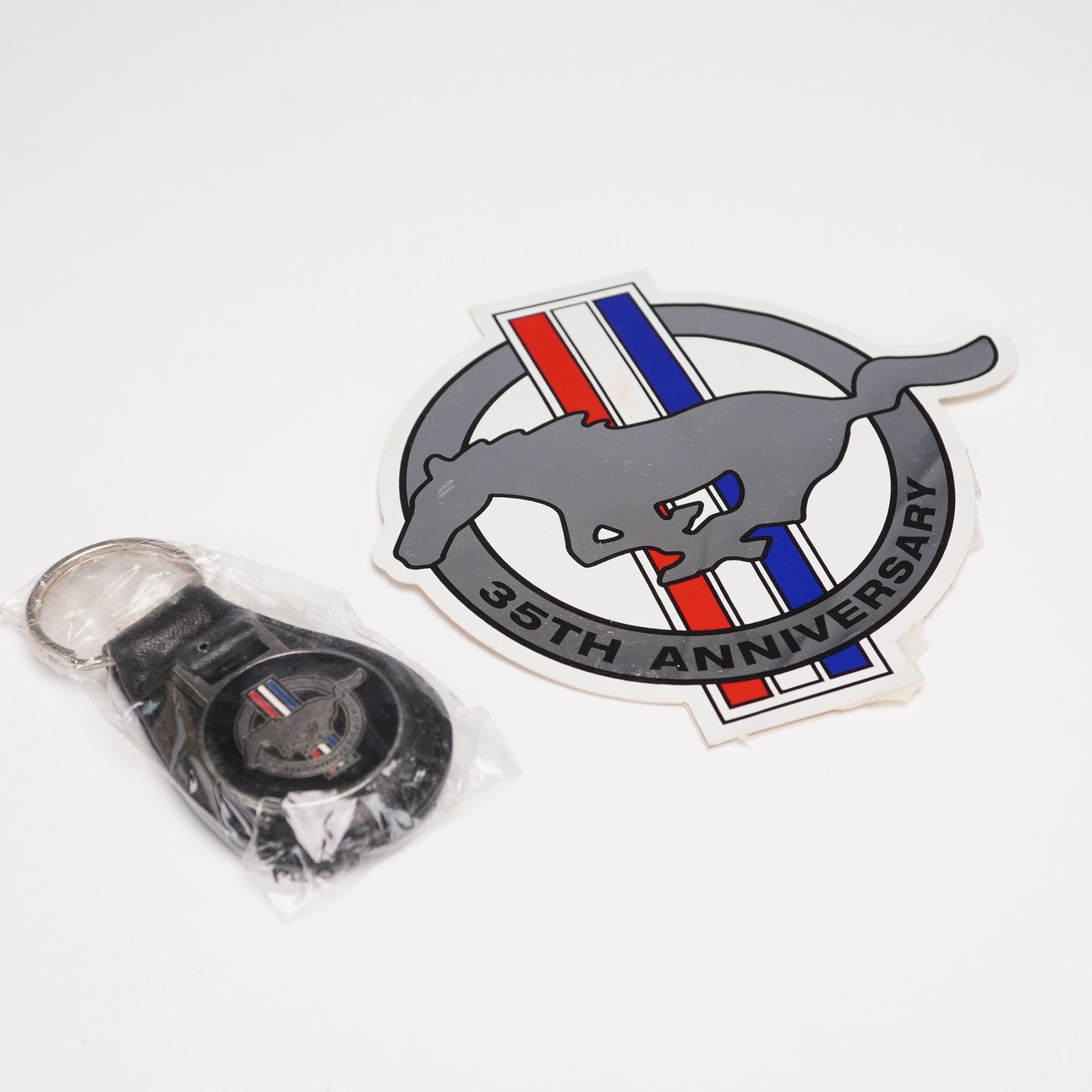 Ford Mustang 35th Anniversary Collector's Box Set. A commemorative box set produced by Ford Motor Company for the 35th anniversary of the Mustang. The set includes the shrink-wrapped hardcover book Mustang Chronicle by Jerry Heasley and the editors of Consumer Guide, a sealed three-disc music collection titled Reborn to Run, a 35th anniversary Mustang keychain, and a matching logo sticker. All items are housed in the original factory-labeled shipping box from Ford Mustang Program Headquarters in Troy, Michigan. A nostalgic tribute to one of America's most iconic muscle cars.