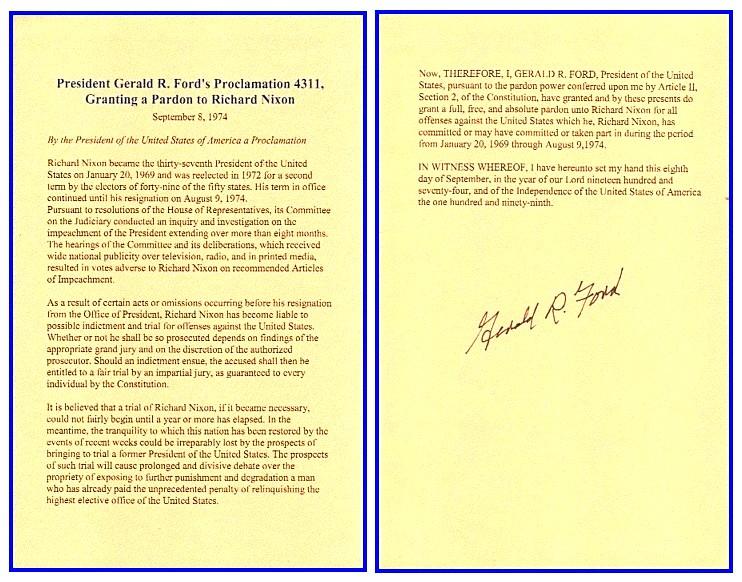 Two-page typed souvenir pardon of Richard Nixon by President Gerald Ford dated 8 September 1974 and measuring 6'' x 9.5''. Contains Ford's clearly written signature in blue felt tip pen. This proclamation by Ford liberates Nixon from having to endure an impeachment trial. In part: ''…I Gerald R. Ford…have granted and...do grant a full, free, and absolute pardon unto Richard Nixon for all offenses against the United States which he has committed.'' Perfect.