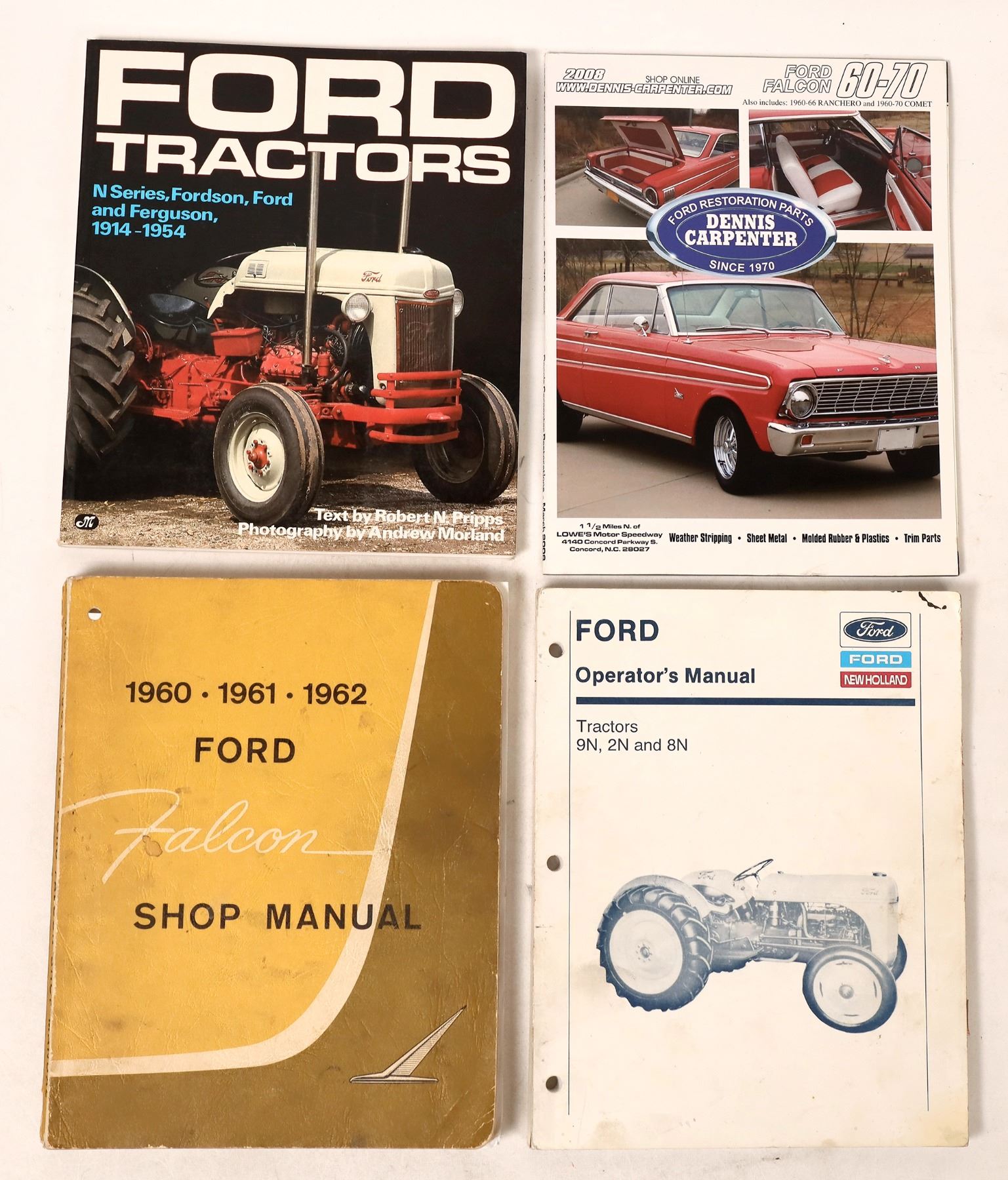 This lot has books for Ford Falcon Shop Manual 1960-1962, Ford Operator's Manual for Tractors 9N, 2N, and 8N, 1952, Ford Tractors N series and Ferguson 1914-1954 a coffee table book with great photos including Hank and Edsel and early engines. A Dennis Carpenter parts book is included.
