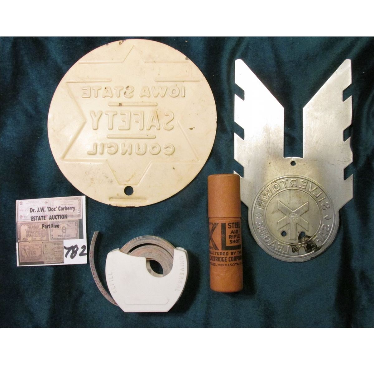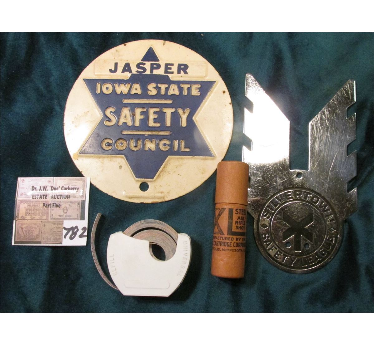 "Ford" Sticker Roll in plastic dispensor; Original Tube of "Steel Air Rifle Shot" (which are BBs) "Federal Cartridge Corporation Minneapolis, Minn."; Large metal sign with hole "Jasper Iowa State Safety Council"; & Chromed Metal "Silvertown Safety League" sign with three holes.