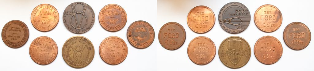 Lot of 8. 1-6) Copper tokens: The Ford 49’er // Stoddard-Wendle Motors / Spokane. 7) Ford / 1903 / 1933 // thirty Years / V8 / of Progress. Rnd, brass, 36 mm. 8) Ford Exposition / 1934 // Ford / V8 / A Century of Progress, Chicago.Rnd, brass, 36mm.