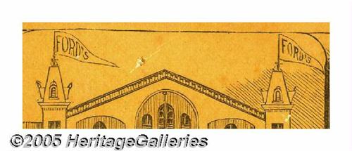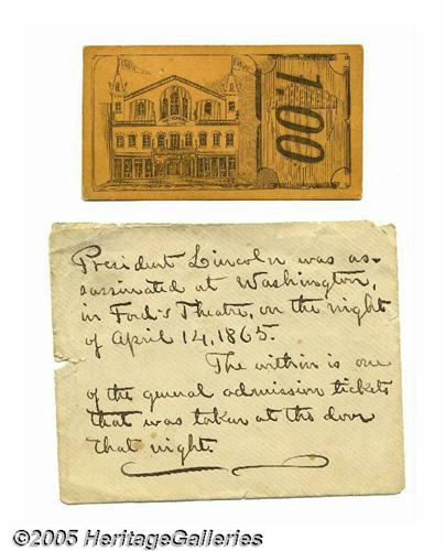 <B>Ford's Theater Admission Ticket From Night of Lincoln's Assassination</B></I> Civil War Union Major J. Franklin Fitts of the 114th Regiment New York Volunteers kept a general admission ticket from Ford's Theatre on the night of President Abraham Lincoln's assassination. The nicely designed ticket pictures the theatre with the name, "Ford's," flying on flags above the roof. Fitts' handwritten note on an accompanying envelope gives the item's provenance. Lot:254