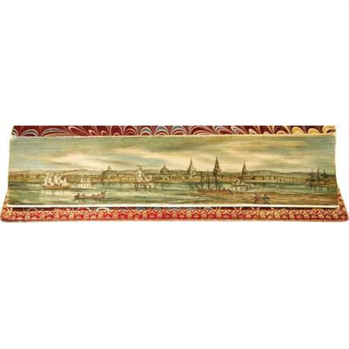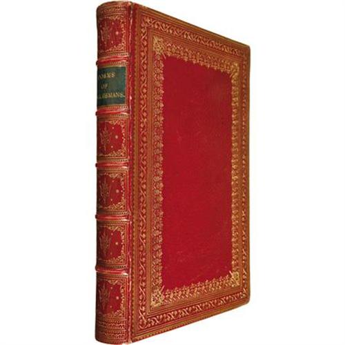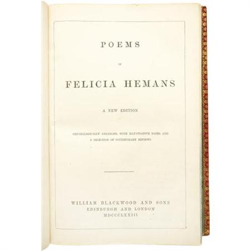 <B>Fore-Edge Painting of Liverpool on <I>Poems of Felicia Hemans</B></I></B></I> (Edinburgh and London: William Blackwood and Sons, 1873), 652 pages, red leather with gilt titles and decorative flourish on the boards, 8vo (6.25" x 9.25"). All edges gilt. The foreground of the fore-edge painting depicts a busy scene in Liverpool harbor, with no less than six watercraft in the painting. Two people watch on the shore as a boat is launched into the water. The cityscape of Liverpool sits in the background. A beautiful painting, with vibrant colors remaining. The painting is in excellent condition on a near fine book, which comes housed in a marbled cloth slipcase.<BR><BR><b>Shipping:</b> Books & Catalogs (<a target="_blank" href="http://www.heritageauctions.com/common/shipping.php">view shipping information</a>)