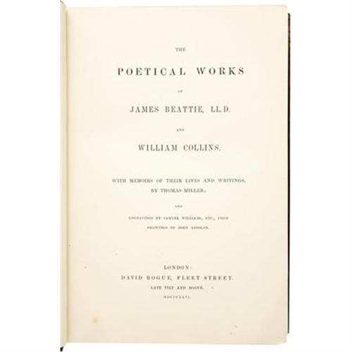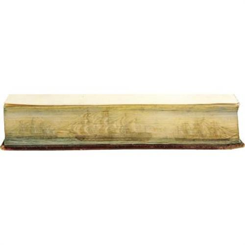 <B>Fore-Edge Painting of Three American Frigates on <I>The Poetical Works of James Beattie, LL.D. and William Collins</B></I></B></I> (London: David Bogue, 1846), 311 pages, maroon leather with gilt spine titles, 12mo (5.5" x 7.75"). All edges gilt. The fore-edge painting shows a full-color scene of three American naval frigates on the high seas, proudly flying the American stars and bars. The painting is in fine condition on a very good book.<BR><BR><b>Shipping:</b> Books & Catalogs (<a target="_blank" href="http://www.heritageauctions.com/common/shipping.php">view shipping information</a>)