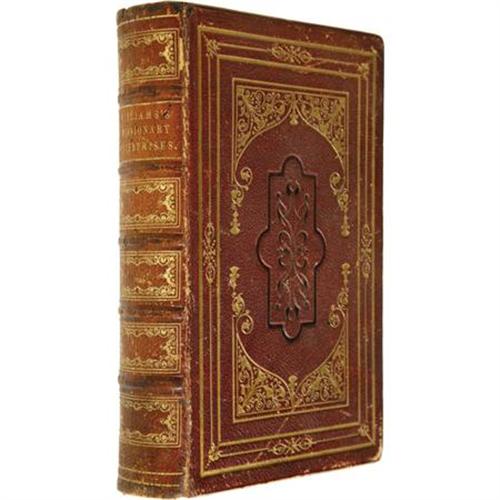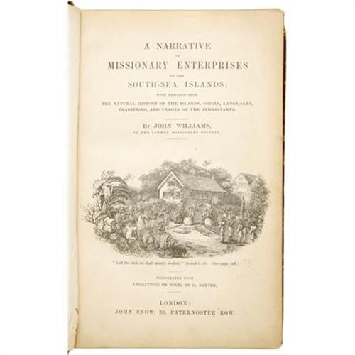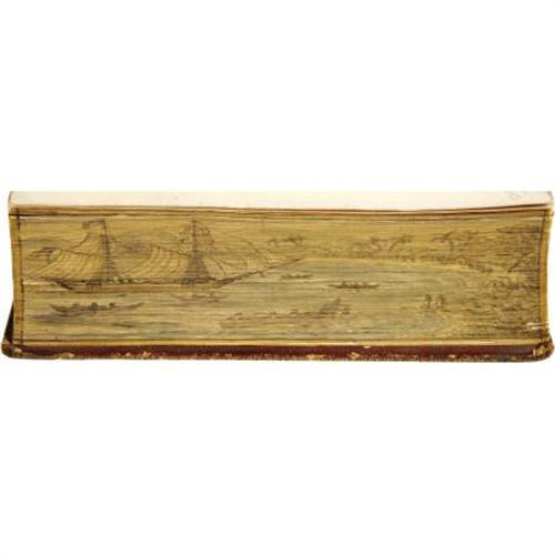 <B>Fore-Edge Painting of an Island Shore Scene on John Williams' <I>A Narrative of Missionary Enterprises in the South-Sea Islands</B></I></B></I><I>; with Remarks upon The Natural History of the Islands, Origin, Languages, Traditions, and Usages of the Inhabitants</B></I> (London: John Snow, nd 19th century ), 506 pages, brown cloth with gilt spine titles and gilt and black decorative stamping on the boards and spine, 8vo (5" x 7.5"). Illustrated with wood engravings by G. Baxter. John Williams was a member of the London Missionary Society. The fore-edge painting here depicts five longboats rowing to the shore of an unspecified island inhabited by indigenous tribespeople, an island much like those discussed in the book at hand. The painting is in excellent shape, on a book in good condition, tightly bound, but worn around the edges and folds. Still, a beautiful example of the art of the fore-edge painting.<BR><BR><b>Shipping:</b> Books & Catalogs (<a target="_blank" href="http://www.heritageauctions.com/common/shipping.php">view shipping information</a>)