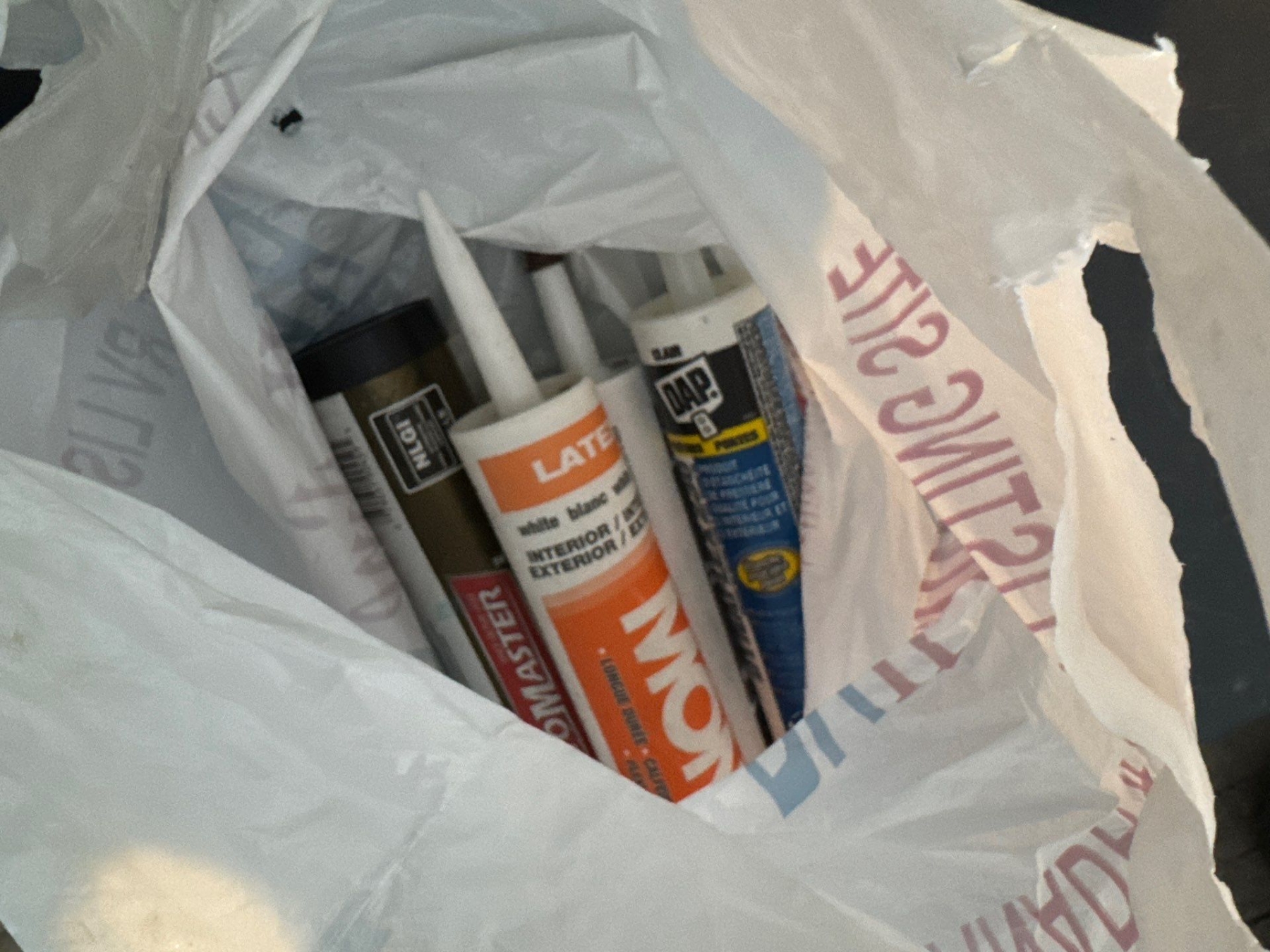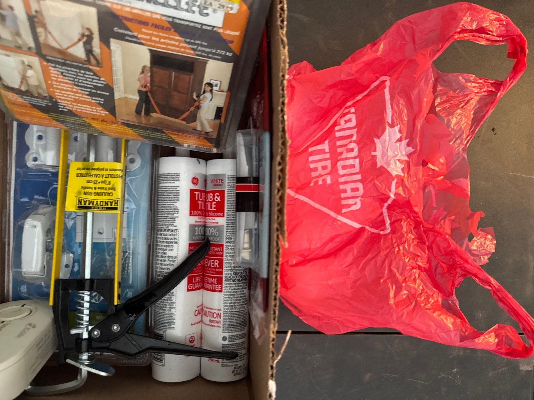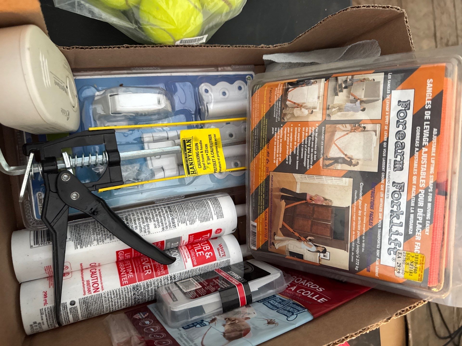 Forearm forklift lifting device. Box of brand new tub and tile silicone with brand new cocking gun, tennis balls, bag of various different cocks. Brand new