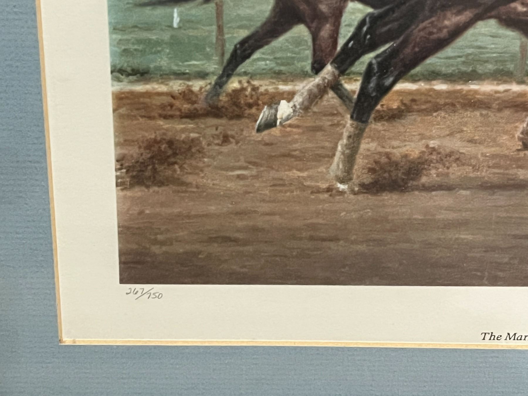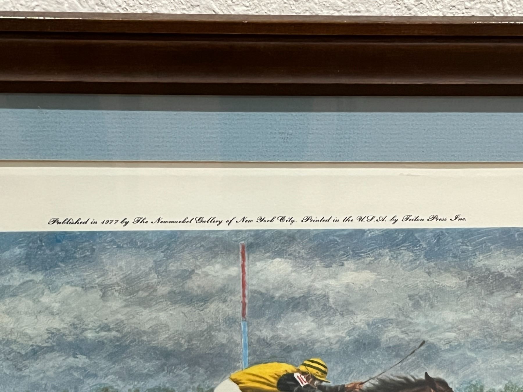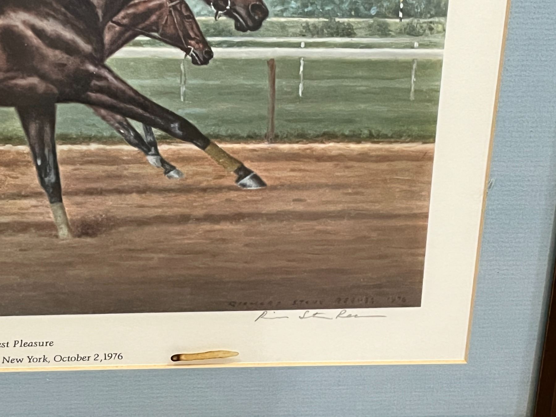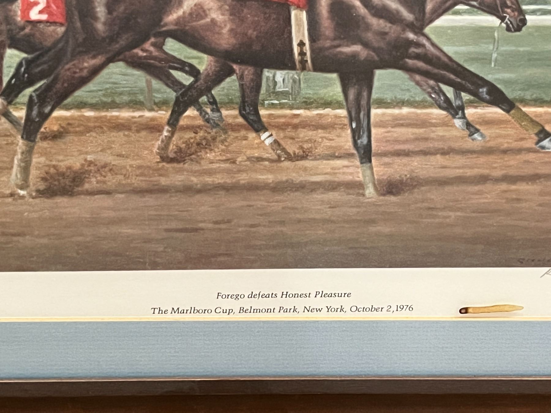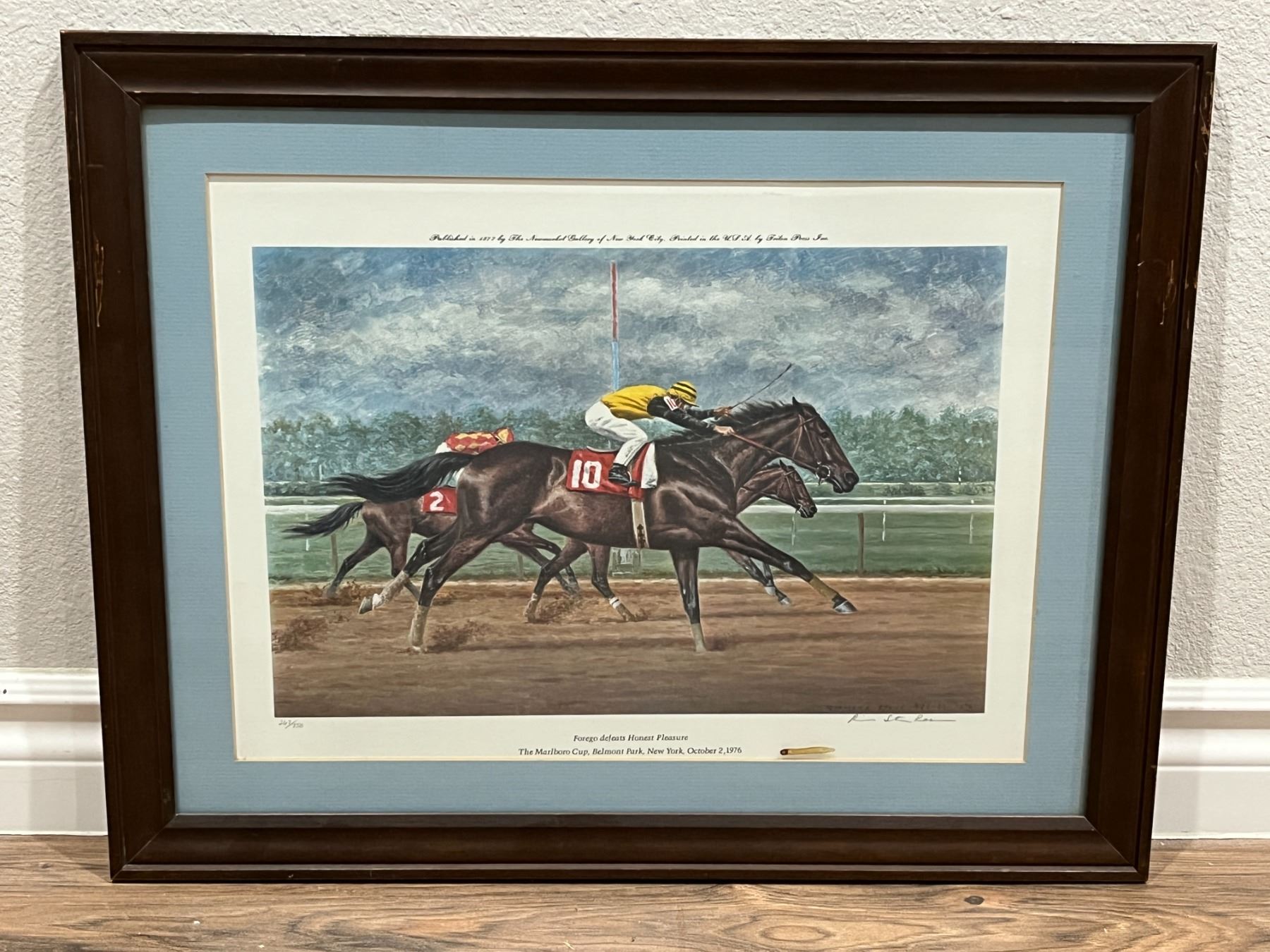 APPRAISER FAIR MARKET VALUE: $600 - "Forego defeats Honest Pleasure" by Richard Stone Reeves (1919-2005): Limited edition lithograph (#267/750) from 1977 depicting the two horses in the stretch at Belmont Park during the Marlboro Cup race. Hand-signed and numbered by the artist. Measures approximately 13" high by 18" wide unframed and 18.5" by 23.5" framed. LT45