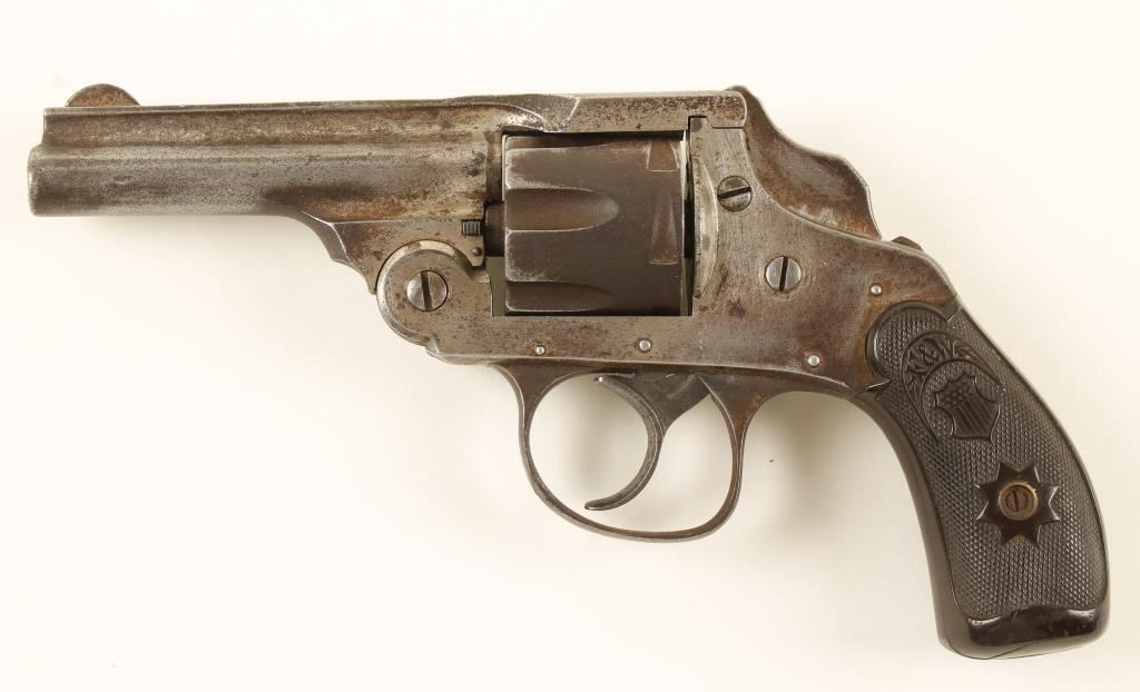 Nickel plated 6-shot top-break double-action revolver with a 3-1/4" barrel and checkered hard rubber grips. Plating remains only in protected areas with the worn areas turning to a brown patina with pin prick pitting. The bore is dull with sharp rifling and lots of pitting. Chambers are also dull with pitting. Action doesn't work. The cylinder will rotate but the hammer doesn't rise or fall. The left grip has a crack on the bottom around the locating pin hole and the right grip has pieces missing on the bottom and the top rear near the knuckle of the grip. Condition is poor. *Modern Firearm*