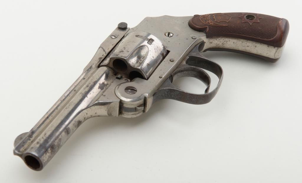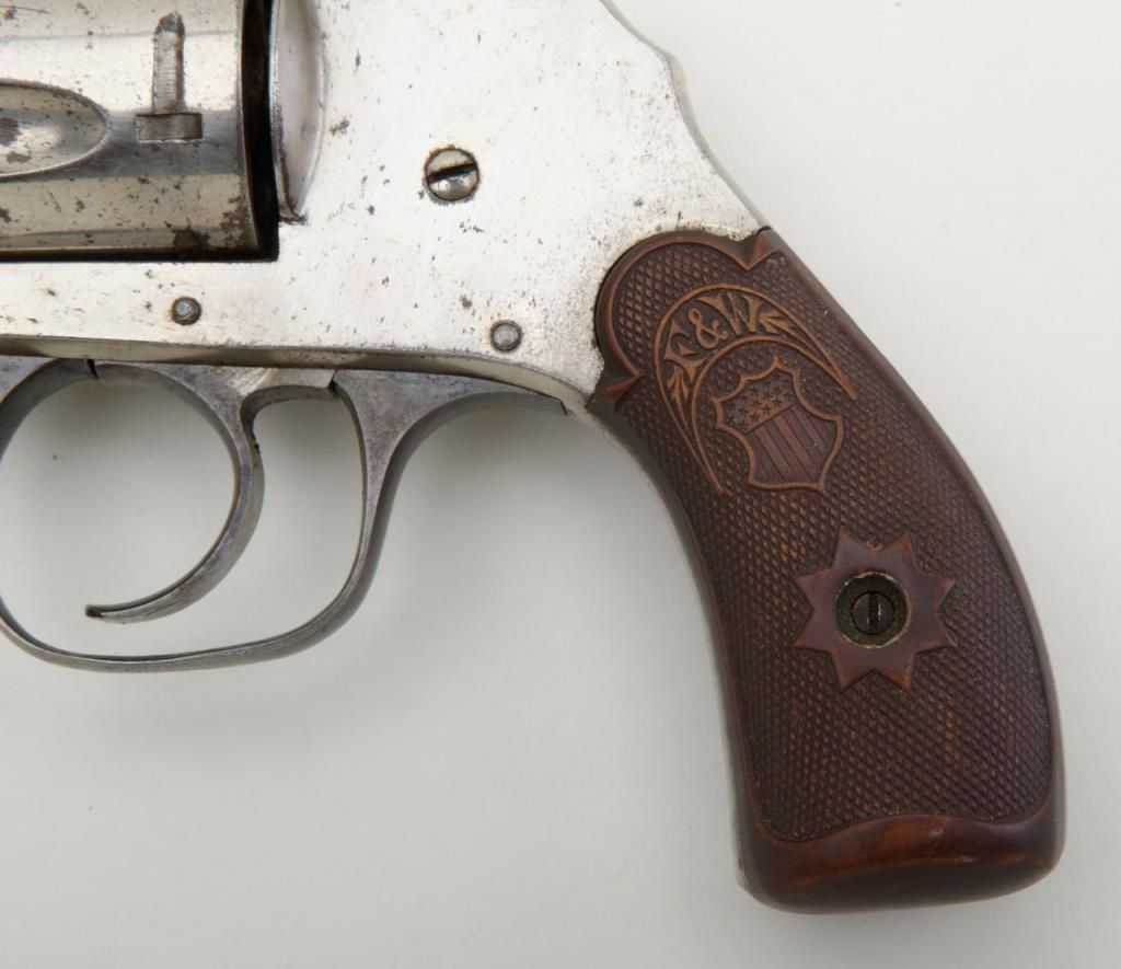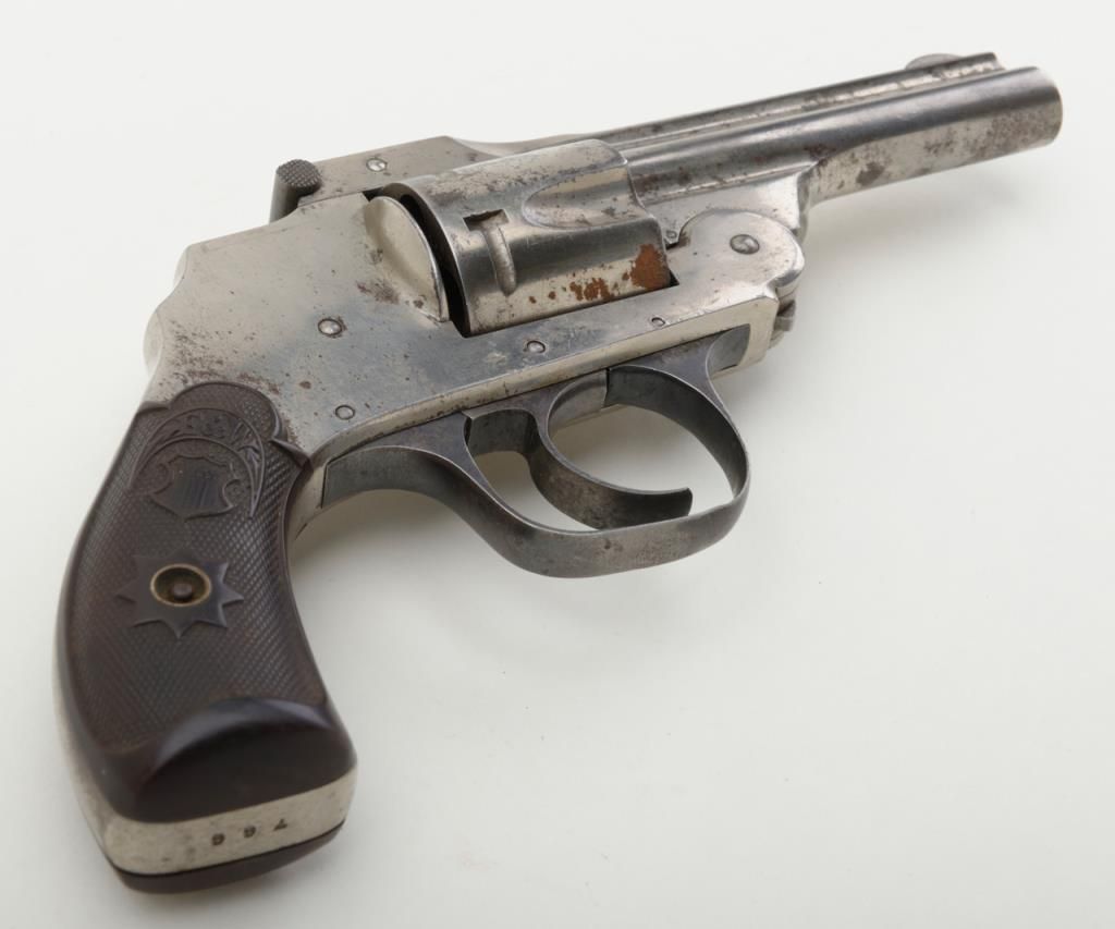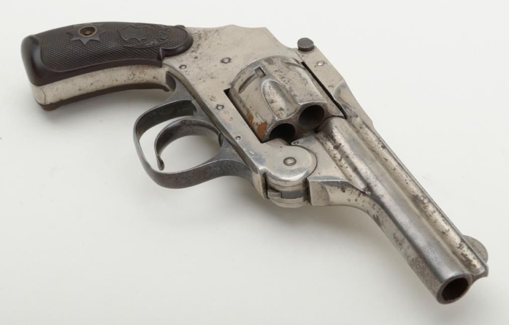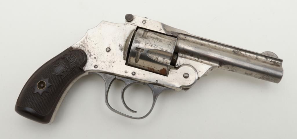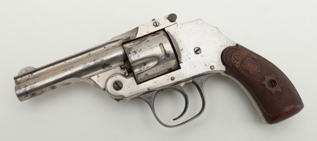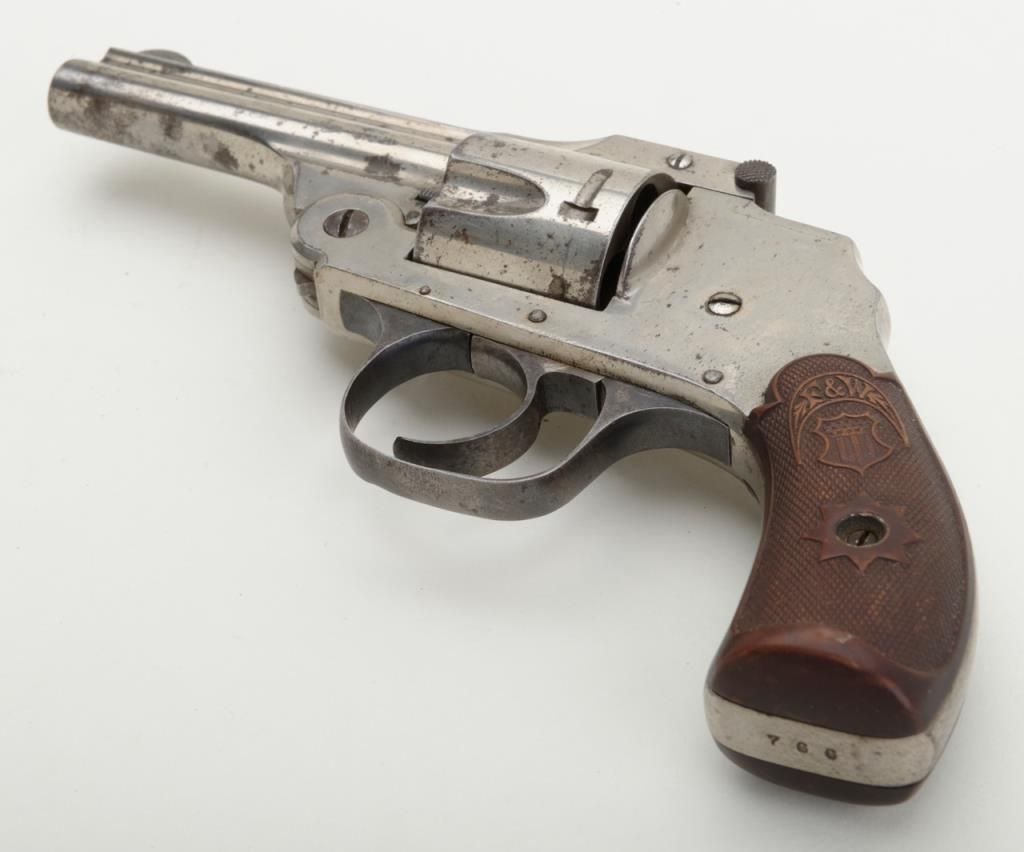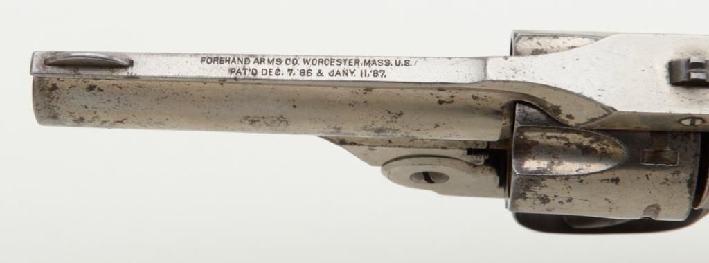 Forehand Arms Co. DA hammerless top break revolver, .38 cal., 3-1/4” barrel, nickel finish, checkered hard rubber black grips with left grip gone tan from exposure to the sun, #766 in overall very good condition showing approx. 60% original frosty nickel finish, good markings, and bore, some scattered spots of erosion on exterior of barrel and cylinder; working action; good grips. Est.: $50-$100.