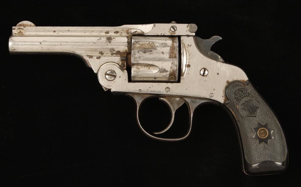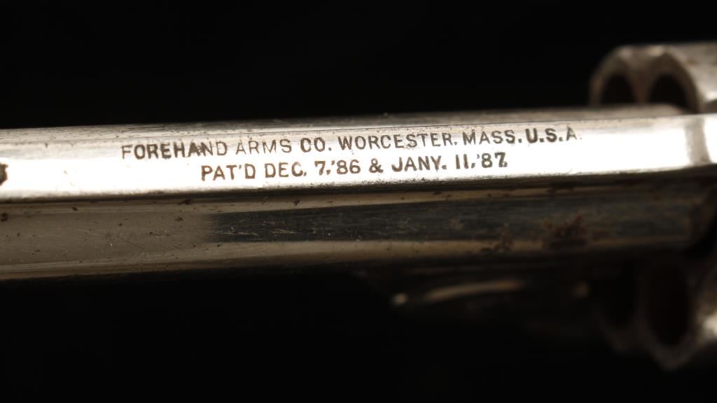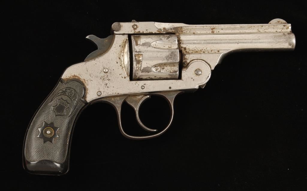 Double action top-break 6-shot revolver. Nickel plated steel frame, cylinder and barrel. With blued hammer, trigger and trigger guard. Black hard rubber grips. Plating is worn and scratched with approx. 75% remaining. Bluing is faded or discolored. The grips have only one small ding in them and the tops of the checkering are worn down. Action works in both single and double action but the lock-up is not very good. The bore has pitting and corrosion but there is strong rifling. Condition is fair. *Modern Firearm*