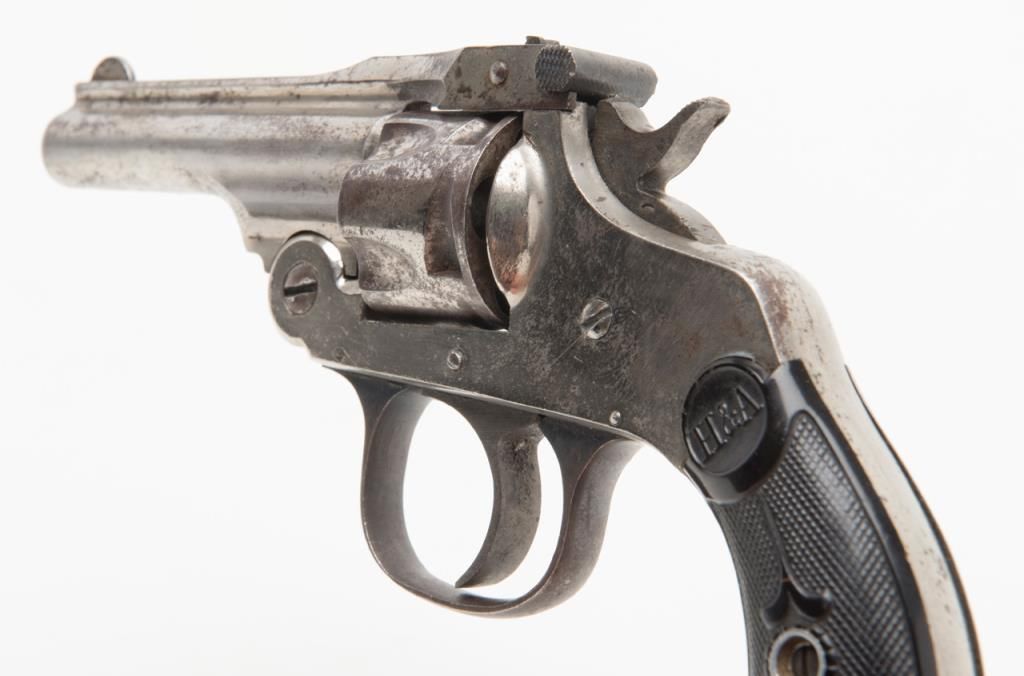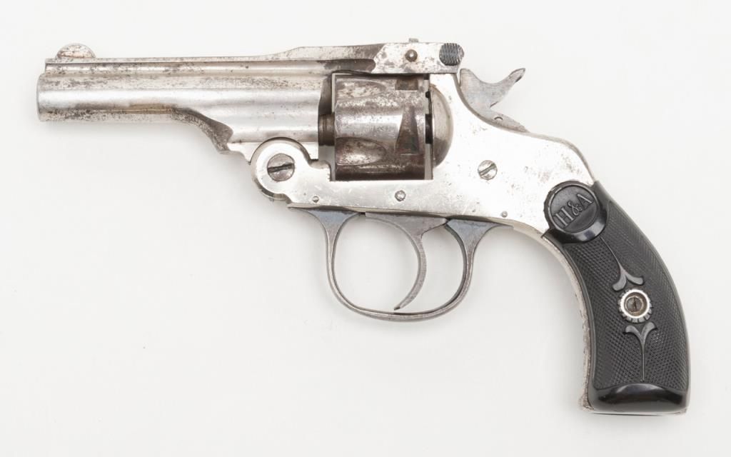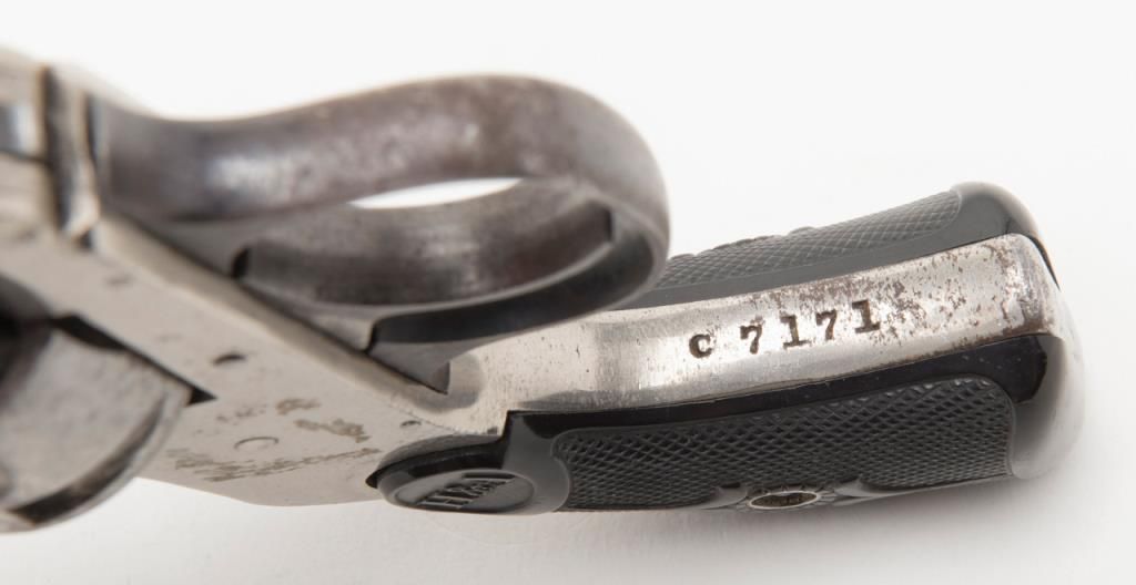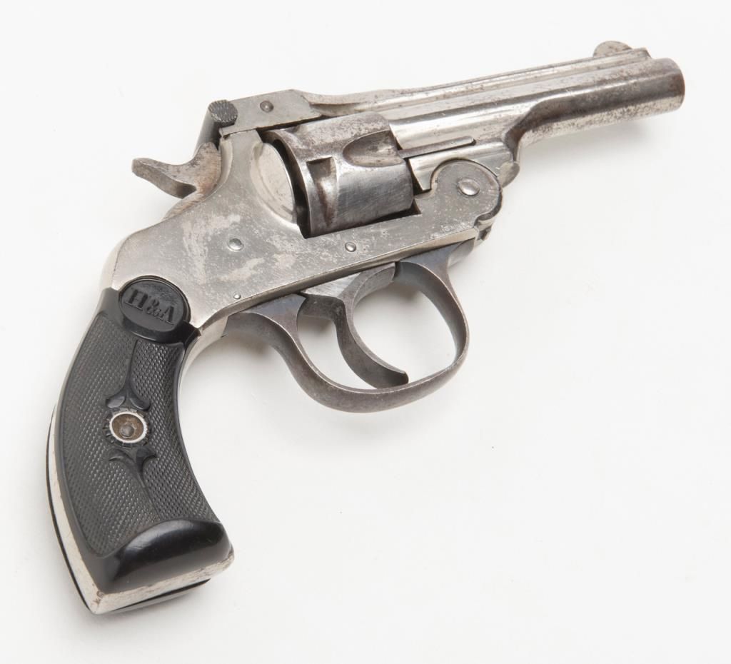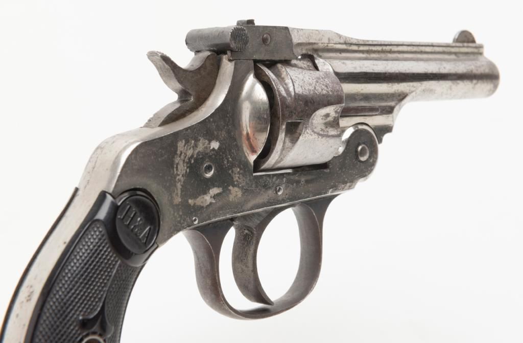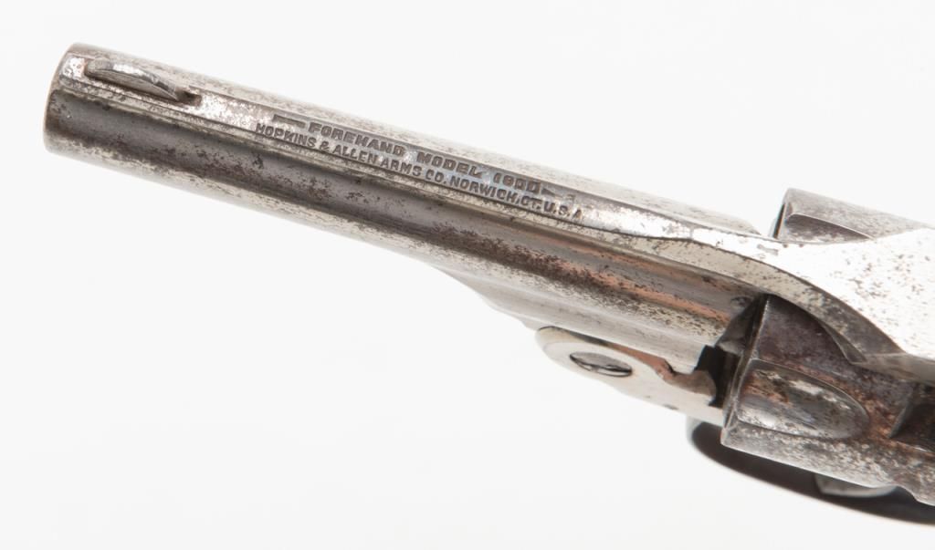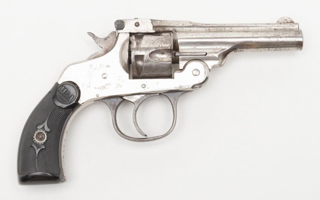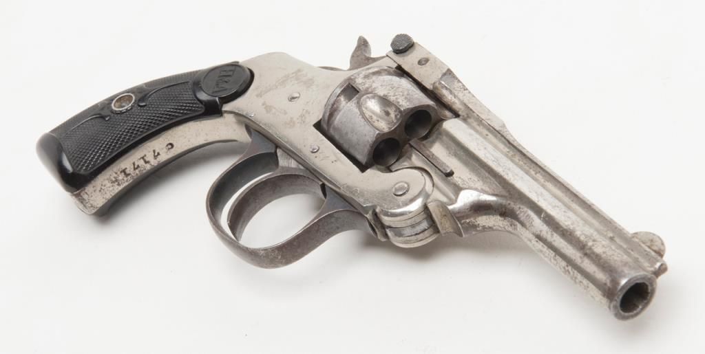 Forehand Model 1900 by Hopkins & Allen DA top-break revolver, .32 cal., 3” barrel, nickel finish, checkered black hard rubber H & A grips, #C7171 in overall very good condition showing considerable original nickel finish, crisp action, good markings and bore, very good H&A emblem grips. (C&R). Est.: $100-$150.