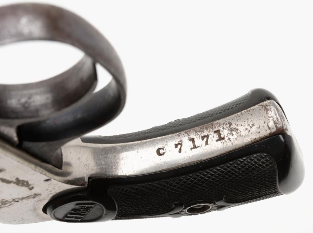 Forehand Model 1900 by Hopkins & Allen DA top-break revolver, .32 cal., 3” barrel, nickel finish, checkered black hard rubber H & A grips, #C7171 in overall very good condition showing considerable original nickel finish, crisp action, good markings and bore, very good H&A emblem grips. Est.: $100-$150.