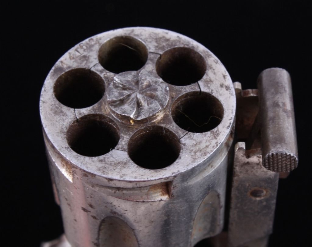 This is a Forehand & Wadsworth .32 caliber double action break over revolver. The piece shows a nickel finish with black hard rubber grips featuring, "F&W" with a patriotic shield with 16 stars and 10 stripes. Top of the barrel is marked, "Forehand & Wadsworth Worcester Mass. U.S.A. PAT'D DEC. 7 (18)86 & JAN. 11 (18)87." Serial number 44168. Wadsworth sold his share of the company to Forehand in 1890 after which the name found on the firearms was just Forehand Arms. This piece was manufactured from 1887-1890. Gun appears to function properly.