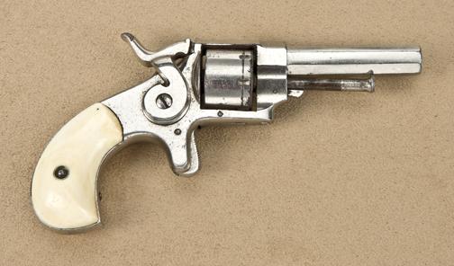 Forehand & Wadsworth, Allen’s patent, .22 caliber single action revolver, factory nickel plated, original ivory grips, serial #30605. The pistol remains in near fine original condition with 80-90% original blue. Some drifting at the edges, firing areas, and a dark patina where the nickel has lifted and just some beginning pitting and erosion in those areas. The markings are sharp, the edges crisp, the grips are very good plus.The front sight blade is missing. The action is good. Est: $300 - $600