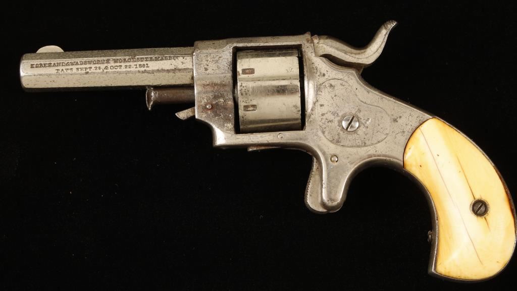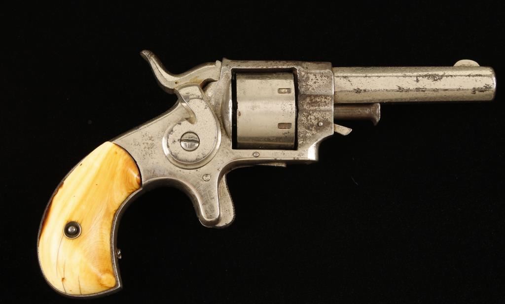 SN: 30681 Nickel plated single-action 7-shot spur trigger rimfire revolver with a 2-7/16" octagon barrel with ivory grips. Plating has edge wear and other wear that has penetrated to the steel frame and rusted or pitted. Bore has rifling with light pitting. Chambers are dull with light surface rust. Grips have yellowed and have cracks as well as a mark on the backstrap that looks like a burn. Action doesn't lock the cylinder. Condition is fair. *Antique Firearm*