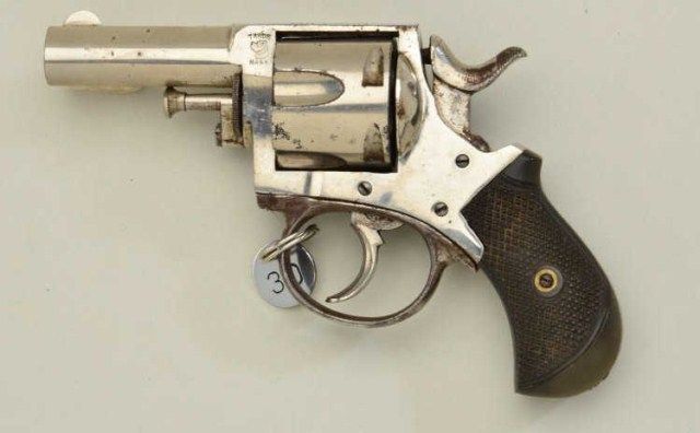 Forehand and Wadsworth Indian Bull-Dog DA revolver with dog head trade mark on top left side of frame, .38 cal., 2-1/2” barrel, nickel finish, checkered hard rubber grips, #21938. This gun is in overall very goodcondition showing the majority of its original finish with some scattered spots of erosion, very good markings, good bore, action is good with trigger return spring needing replacement; overall good grips.Est.: $400-$800.