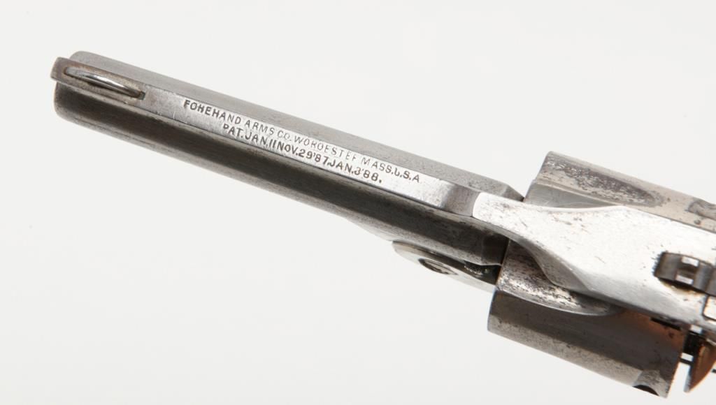 Forehanded & Wadsworth .38 S&W caliber double action revolver with last patent date 1886 remaining in good original condition showing 50% to 70% original nickel. The revolver shows some minor pitting and erosion with just normal aging.The grips are very good. The action works well and the bore is good. Est.: $150-$300
