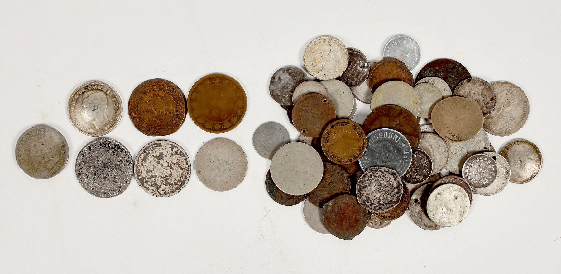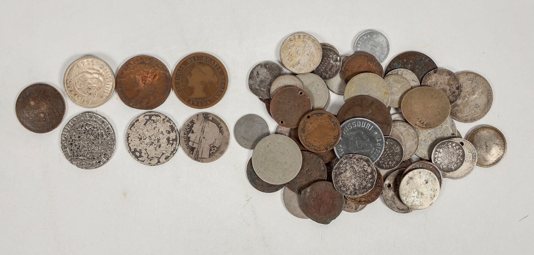 Sixty foreign coins, well worn, many holed, some fashioned into buttons or with loops for hanging.