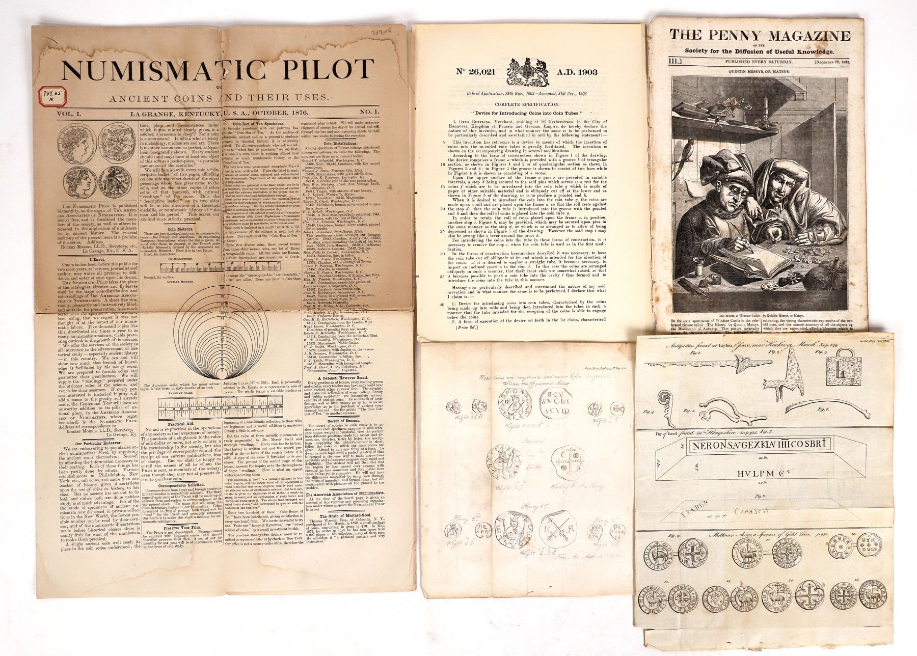 Five pieces of vintage foreign coin ephemera: 1) Numismatic Pilot; Volume 1, No. 1; LaGrange Kentucky 1876; 2) The Penny Magazine; December 1833 cover drawing of The Misers at Windsor Castle; 3) Application of invention of a device for Introducing Coins into Coin Tubes," from the city of Hannover, Prussia; 4) 1797 magazine page with drawings of medieval coinage; 5) 1793 magazine page with drawings of ancient and medieval coins.