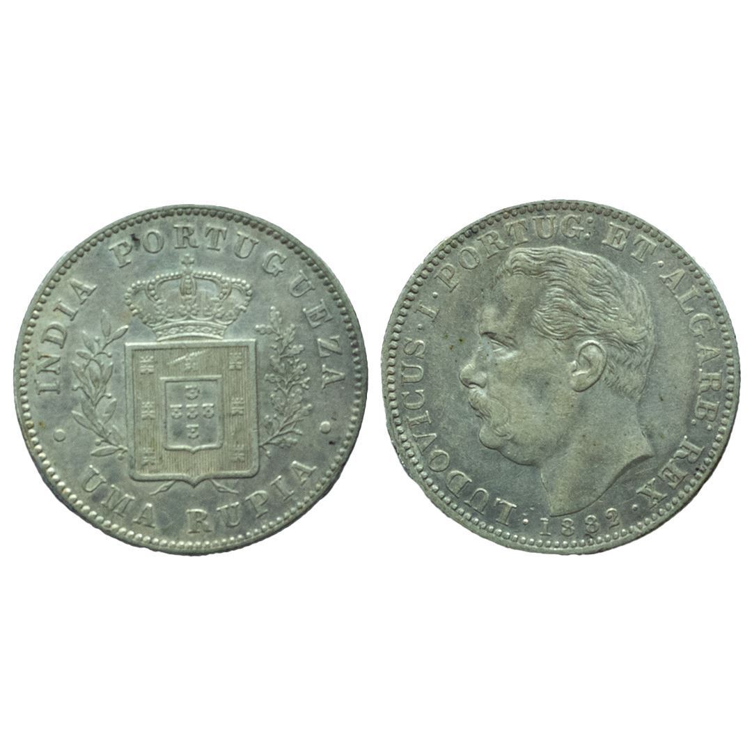Foreign Coins, India-Portuguese, Ludovicus I, Silver Uma Rupia, 1882 AD, Obv: burst of the ruler to left, Rev: crowned arms with in sprays, 11.61g, 29.00mm, (KM# 312), about very fine.