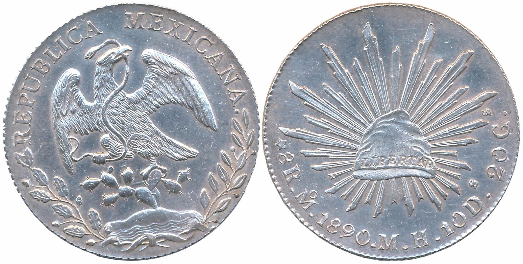 Mexico, Silver 8 Reales, 27.11g, 1890, Zacatecas Mint, Obv: Facing Eagle, Snake in beak, Rev: Radiant cap (KM# 377.13). Very fine, scarce.
