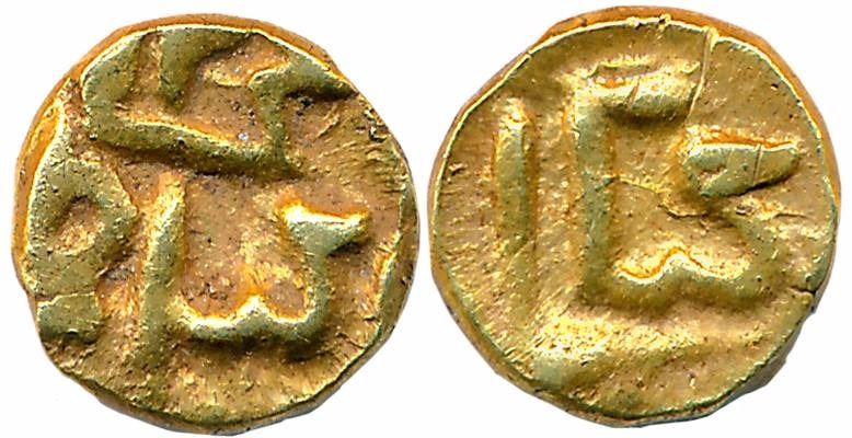 Nepal, Malla Dynasty, Shiva Simha, Gold Mashaka, 0.92g, Obv: Maithili letter "Sri", Rev: Maithili legend "Shivasya". Very fine, rare.