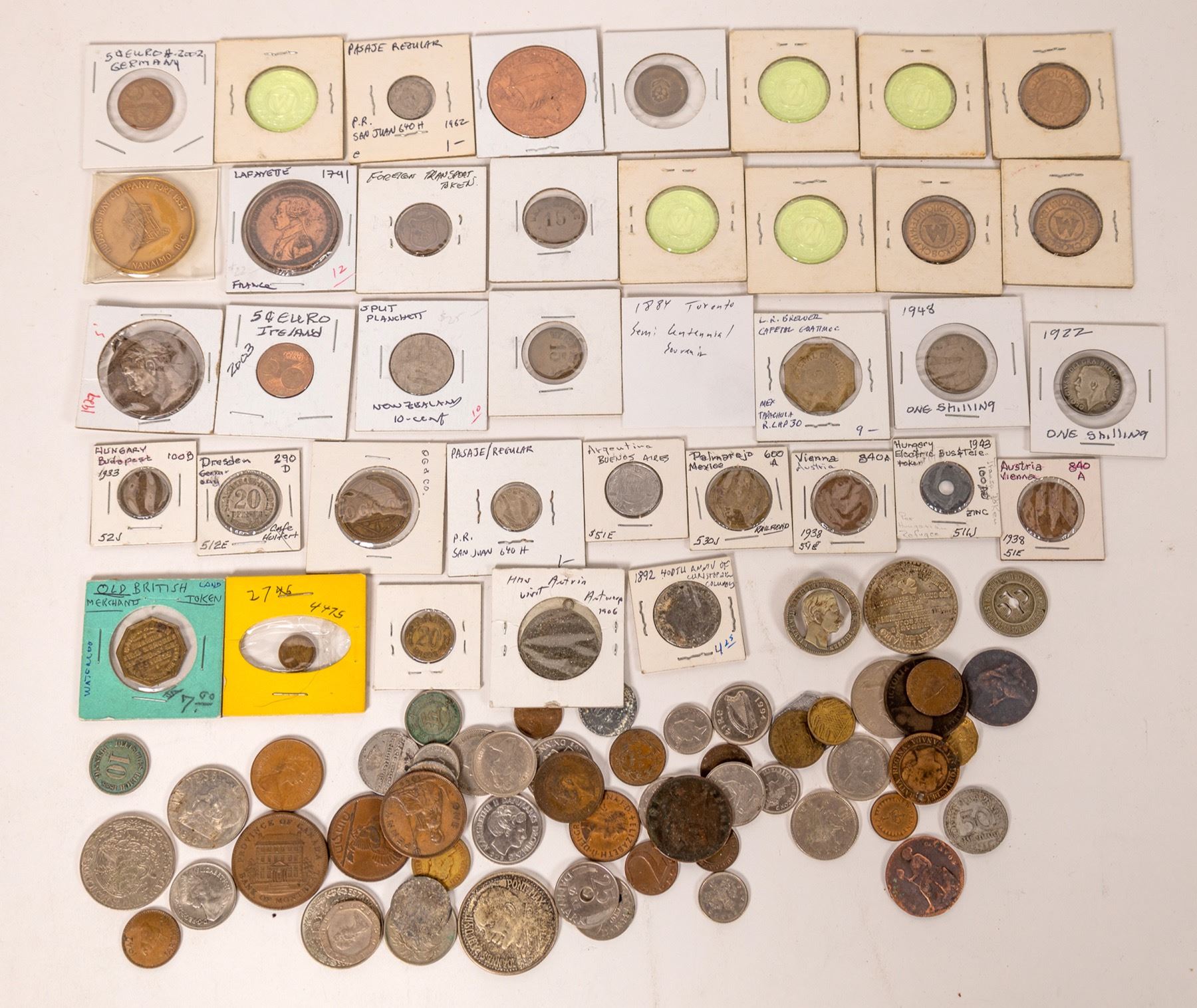 Lot of over 90 foreign coins, medal and tokens. Czechoslovakia, Mexico, Austria, England, Hungary, New Zealand, Argentina, Puerto Rico, Canada. Pope Pius, Kaiser Wilhelm and many more. Contains some silver pieces. City: State: Date: