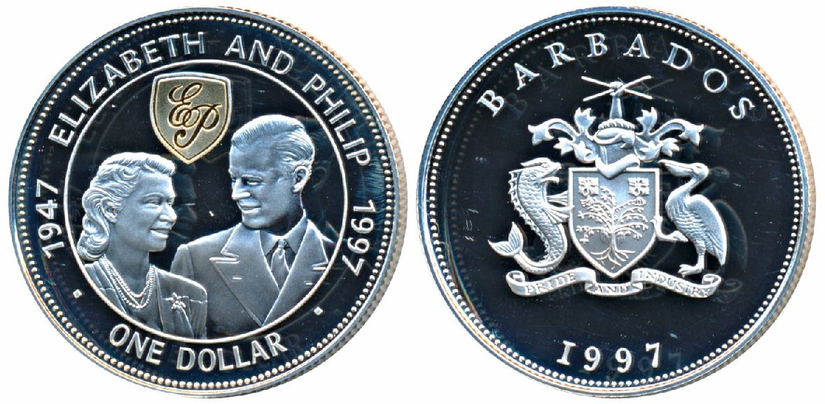Barbados, Elizabeth, Silver Dollar, 10.24g, rev. Golden Anniversary of Queen Elizabeth and Prince Philip, with gold inset monogrammed shield 1997 (KM 64). Proof.
