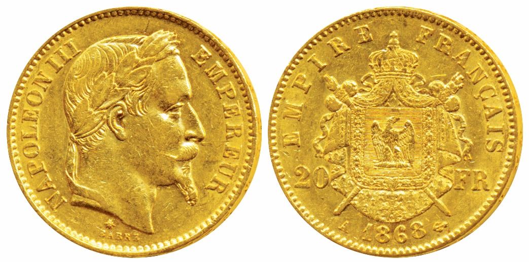 France, Napoleon III, Gold 20 Francs, 6.47g, 1868 A, Paris Mint, obv. laureate head, rev. Imperial arms on mantle (KM 801.1). About Extremely Fine.