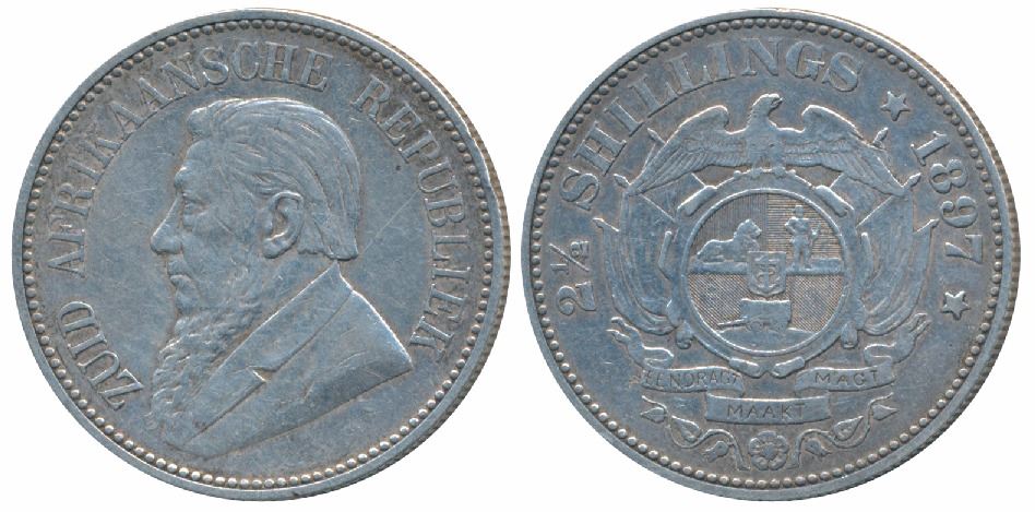 South Africa, Silver 2 ½ Shilling, 1897, rev. lagged arms above banner, with an eagle at top (KM 7). Very Fine+, Rare.