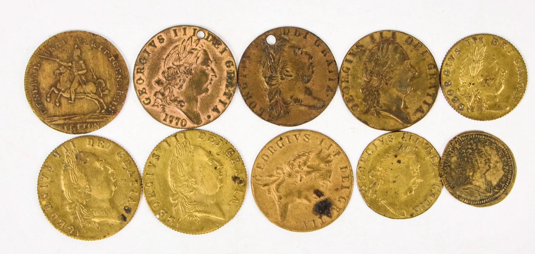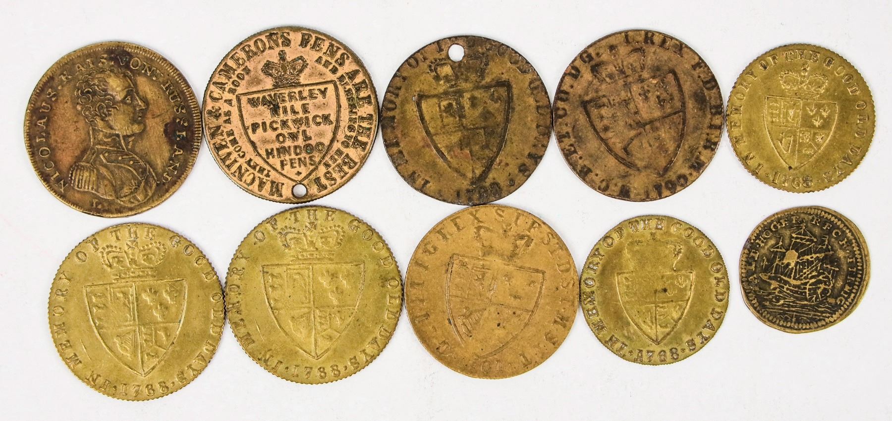 Found in a batch of coins and tokens from the 1830s-1870s: ten foreign counters ranging in size from 19 mm to 25 mm. Most have George III.