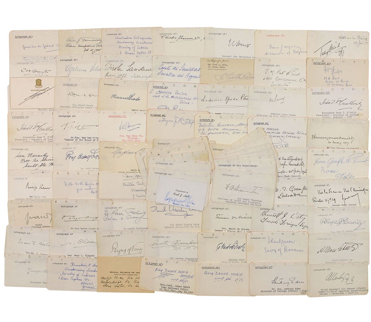 Collection of approximately 82 ink signatures of foreign dignitaries, primarily on individual off-white 4.5 x 2.5 pages, some lined. Signers include: Grand Duke Alexander, Anthony Eden, David Lloyd George, Wilfred Grenfell, Thomas Lipton, Maxim Litvinov, and Count Felix von Luckner. In overall fine condition, with light edge toning.